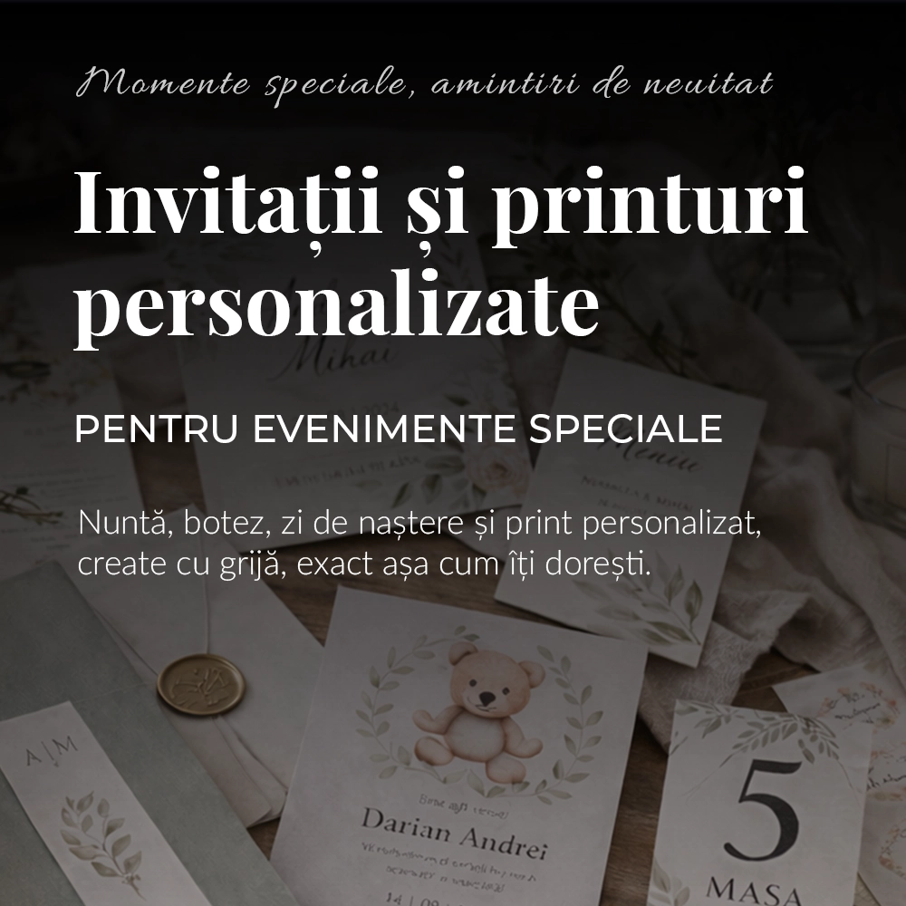 La Bright Invitation, transformăm invitațiile în opere de artă. Alege din colecții rafinate pentru nuntă, botez sau evenimente speciale – personalizate cu grijă pentru a reflecta povestea ta. Descoperă designuri elegante, materiale premium și o experiență de comandă fără stres. Creează un început memorabil al evenimentului tău chiar azi!