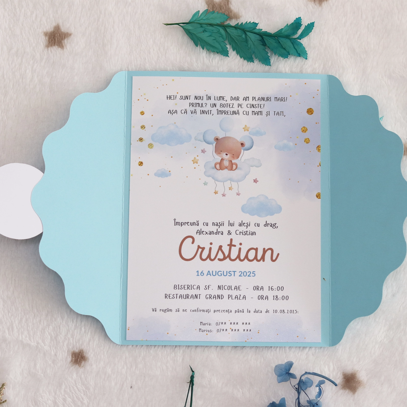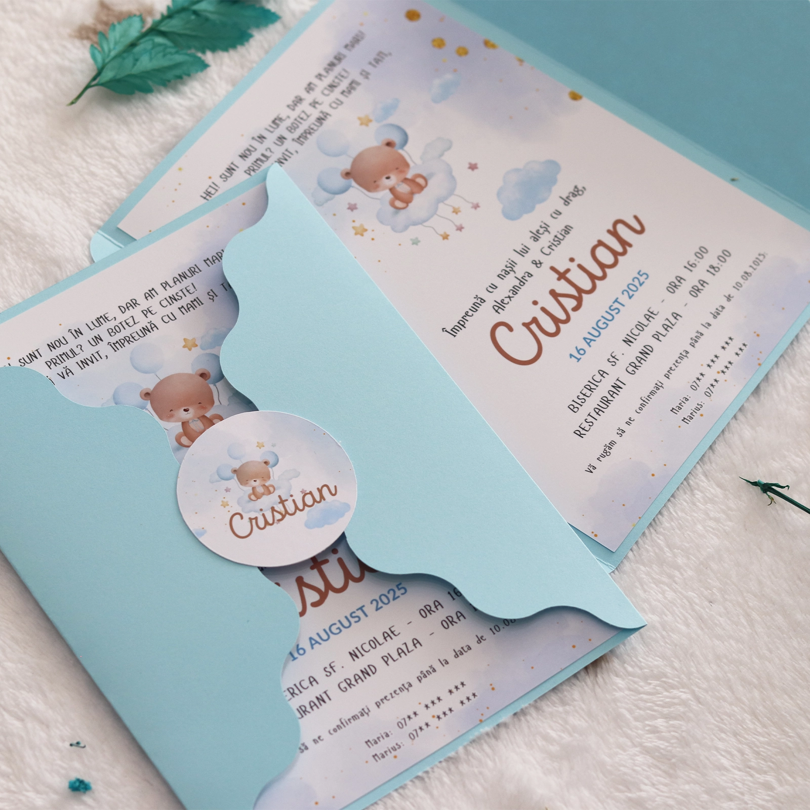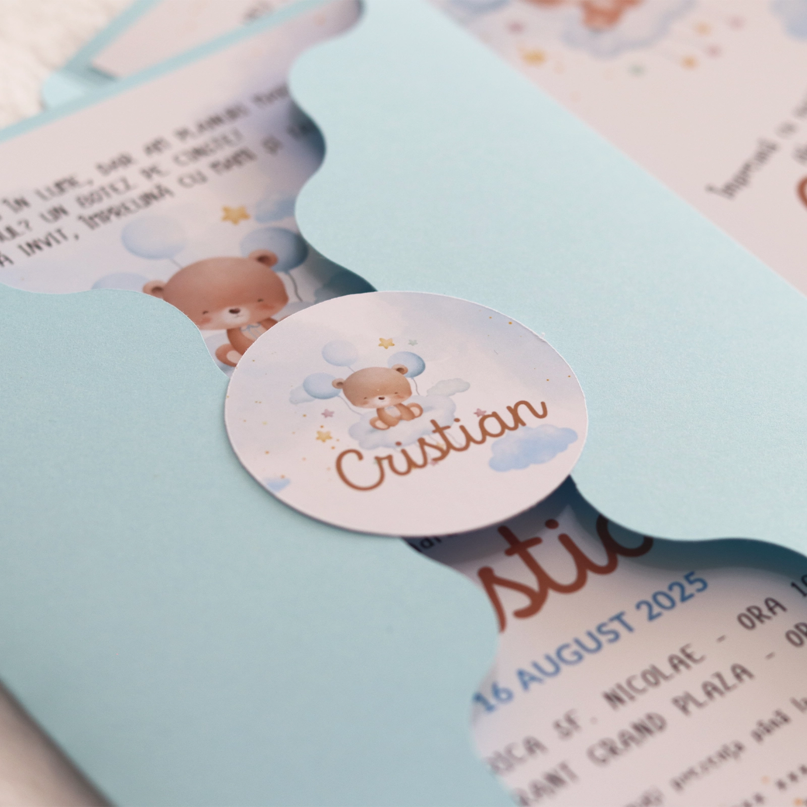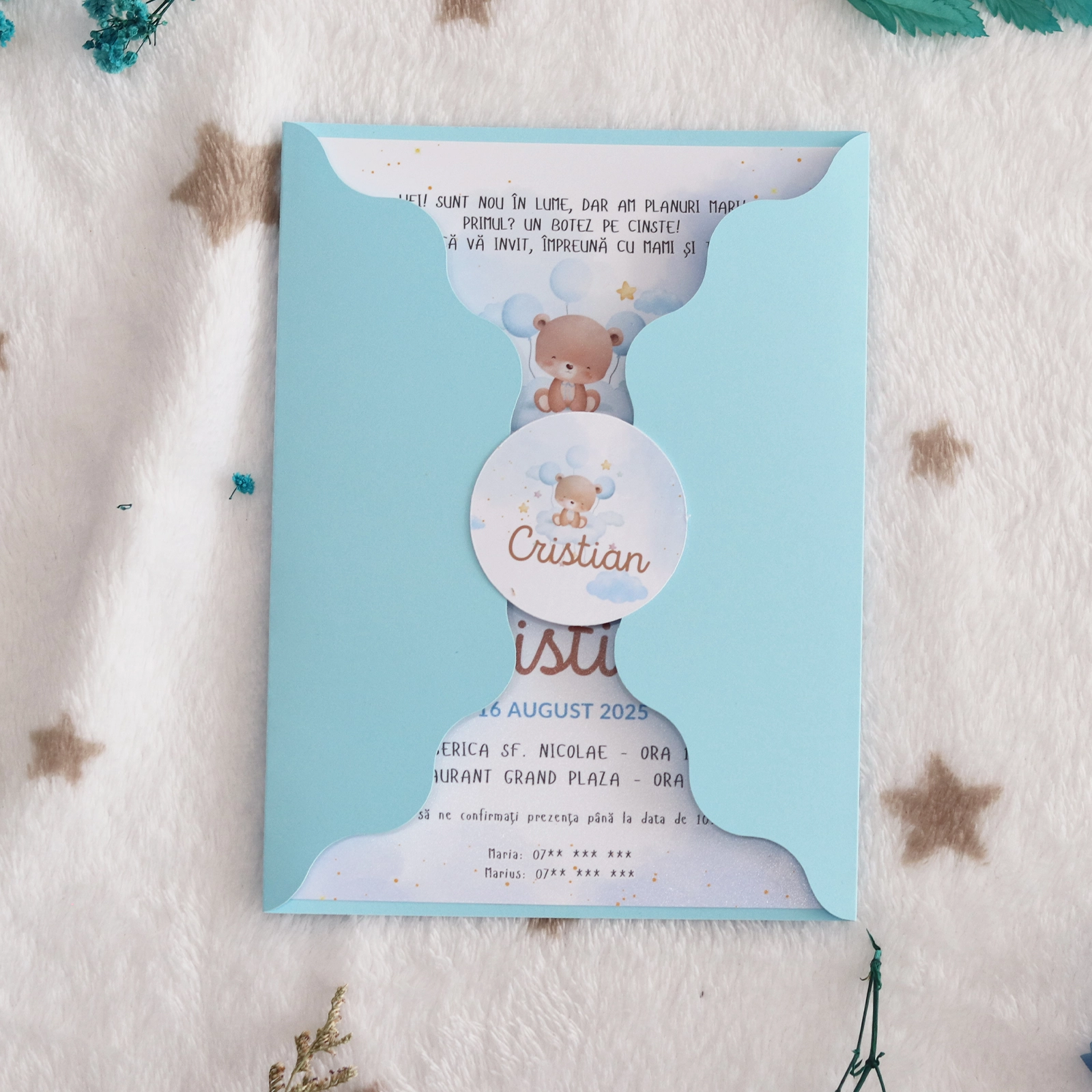 Designul cu ursuleț albastru transmite gingășie, inocență și bucuria primelor momente de viață. Cartonul satinat oferă un aspect sofisticat, iar plicul handmade adaugă un plus de rafinament și personalizare.