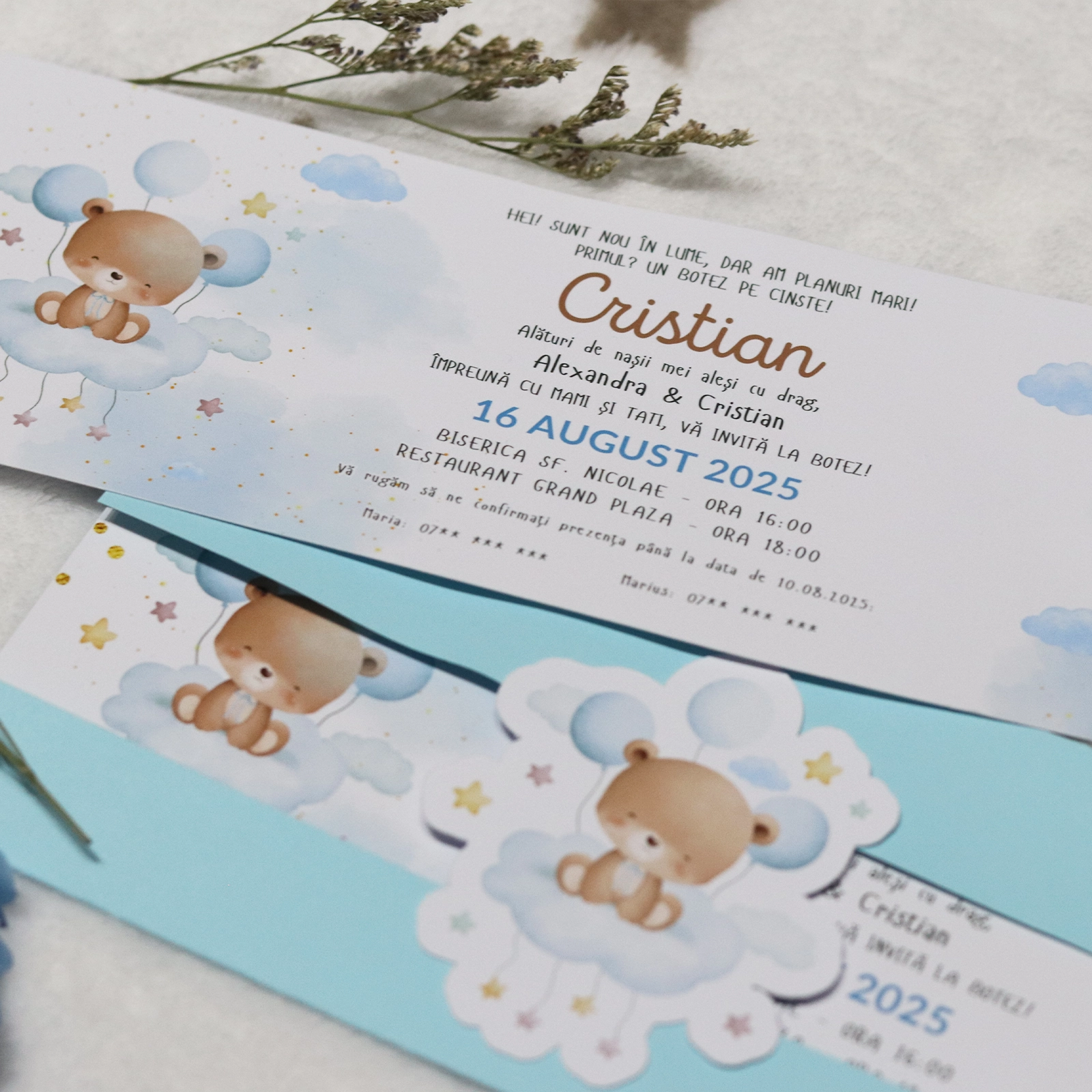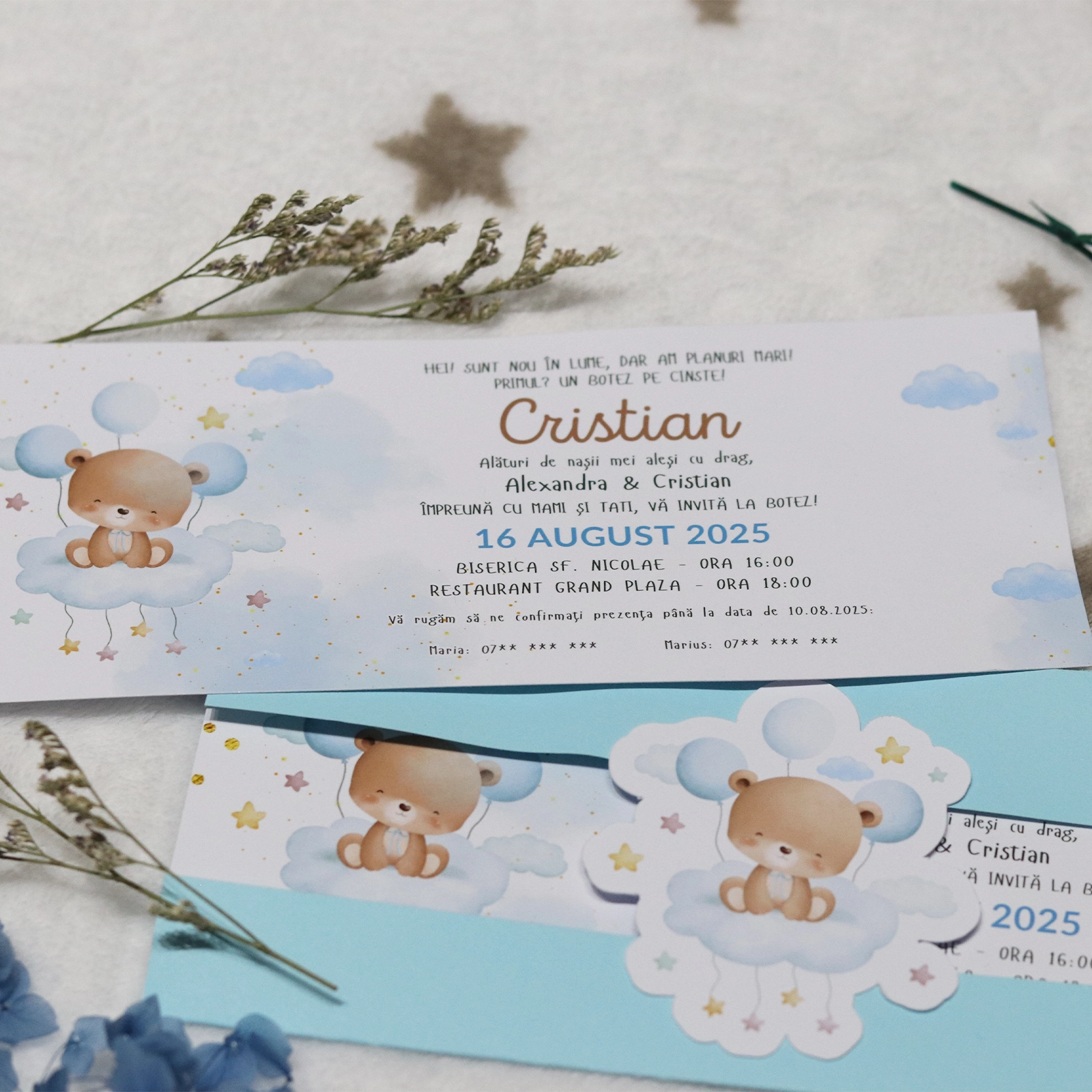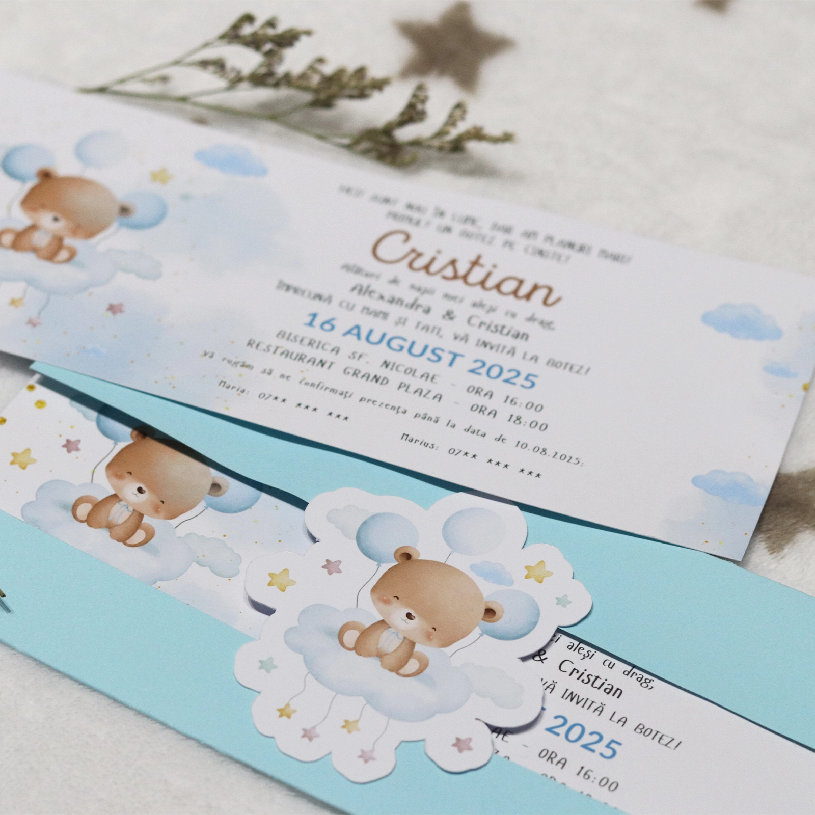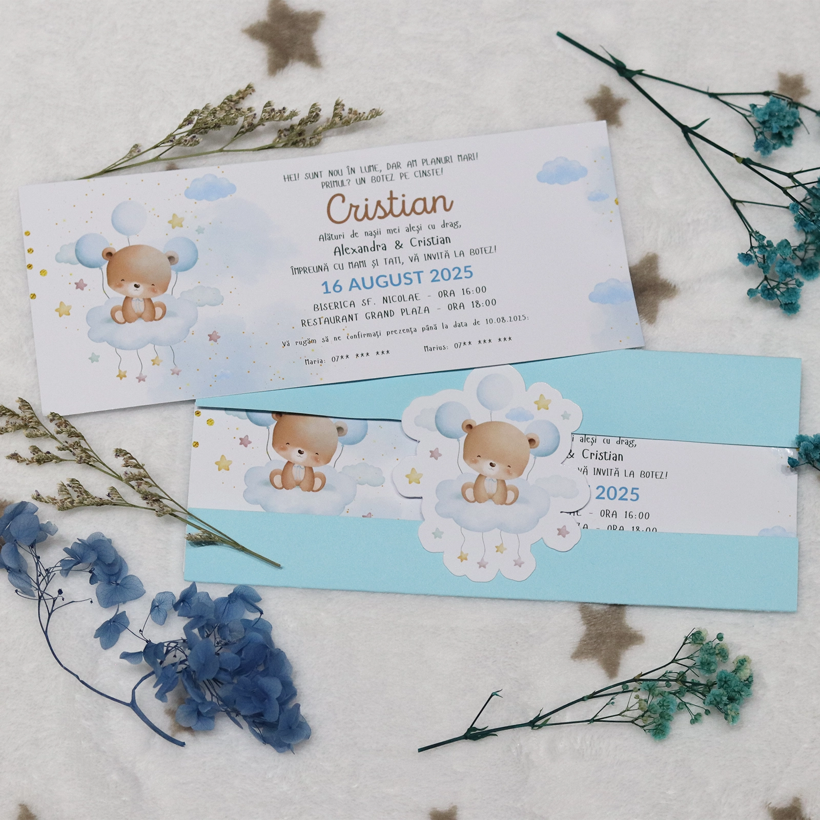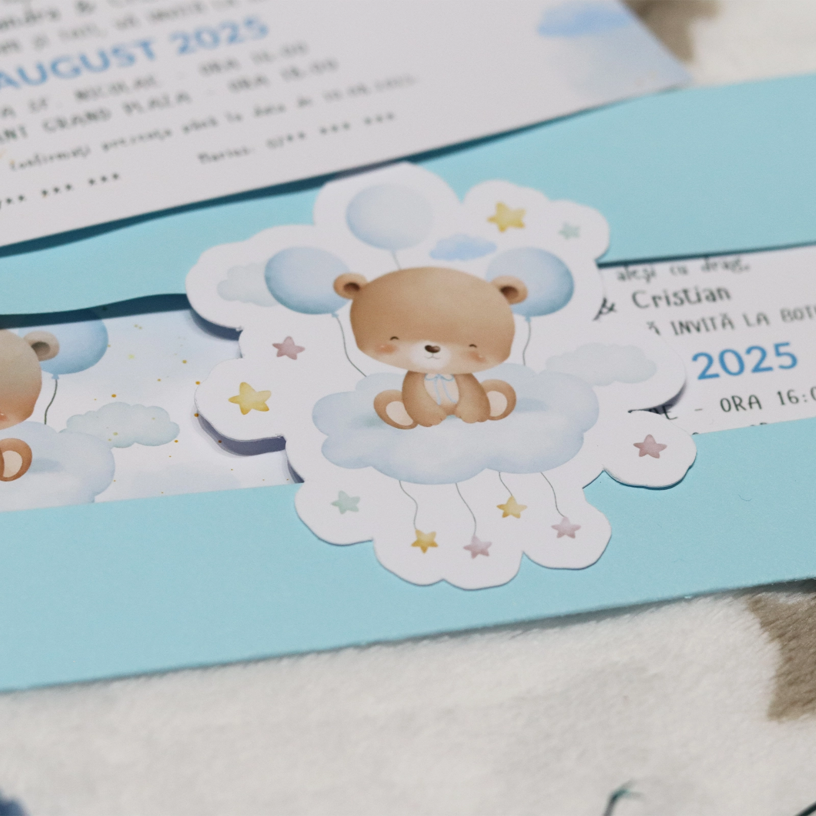 Invitația este completată de un toc albastru, care protejează și pune în valoare designul, și de un sticker decorativ cu ursuleț, perfect pentru sigilare sau ca detaliu suplimentar în prezentare.