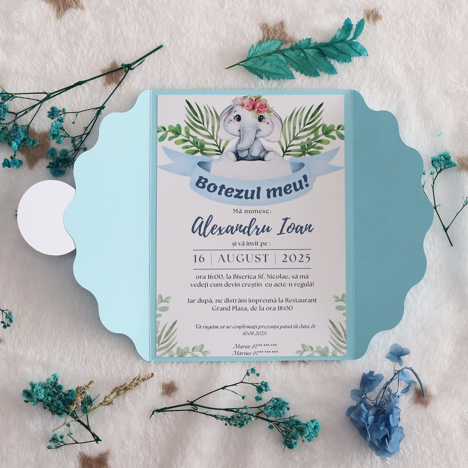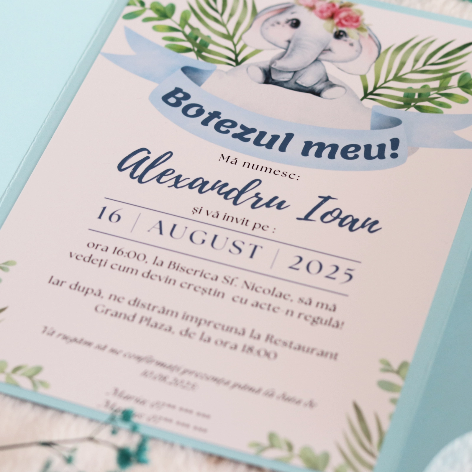 Ideală pentru botezurile de băieței, această invitație de botez cu elefant și plic albastru transmite delicatețe, grijă și emoție – o amintire pe care familia o va păstra cu drag.