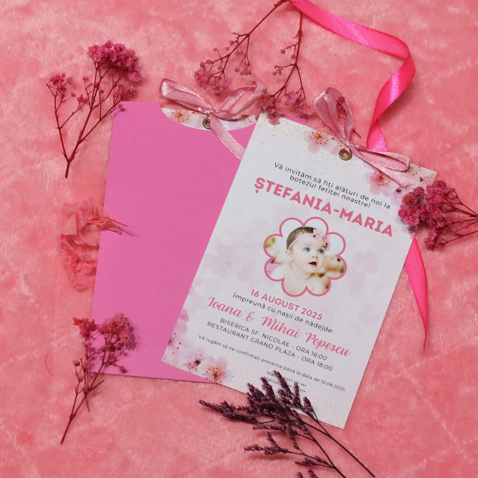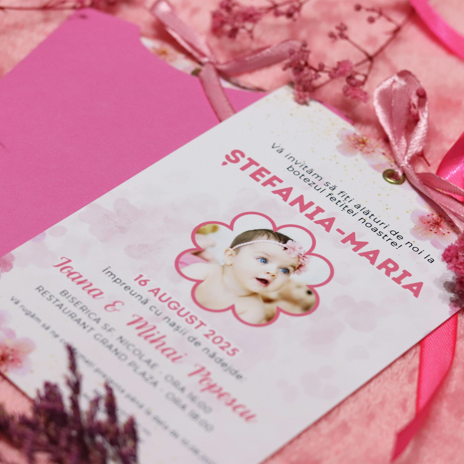 Tipărită pe carton de calitate, invitația are un text complet personalizabil, adaptat stilului dorit. Plicul roz adaugă un plus de rafinament și completează perfect aspectul final.