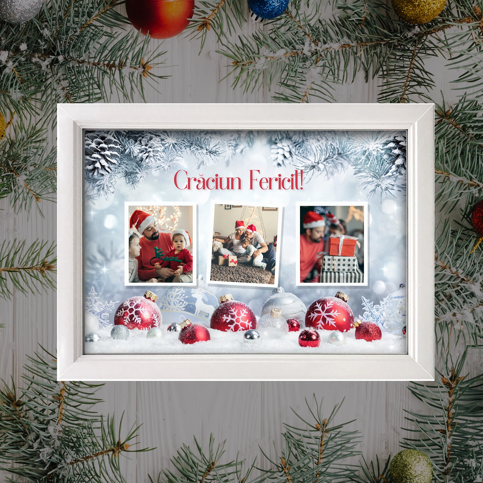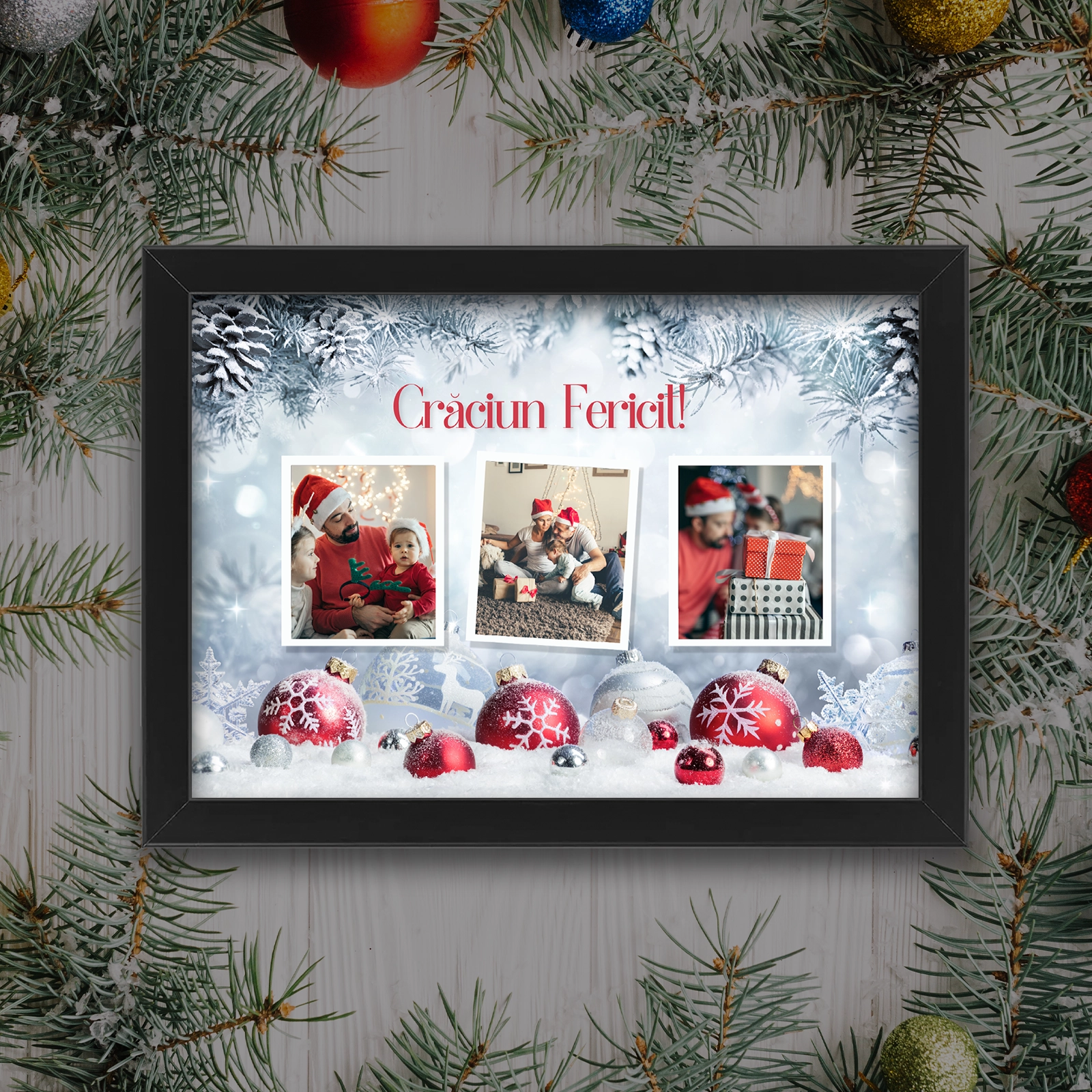 Imortalizează magia Crăciunului și împarte cele mai dragi amintiri într-un tablou elegant și personalizat. Acest cadou deosebit reunește 3 fotografii alese de tine și un mesaj special, creând un ornament plin de semnificație pentru sărbătorile de iarnă.