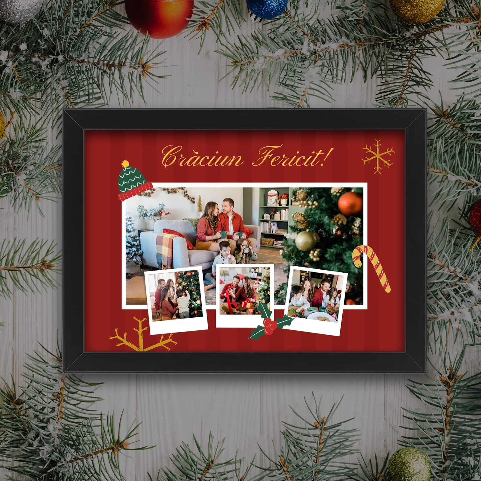 Adaugă un strop de căldură și emoție în decorul tău de sărbători cu acest tablou elegant de Crăciun, personalizat cu patru fotografii alese de tine și un mesaj semnificativ. Este cadoul perfect pentru a împărtăși amintiri și sentimente cu cei dragi.
