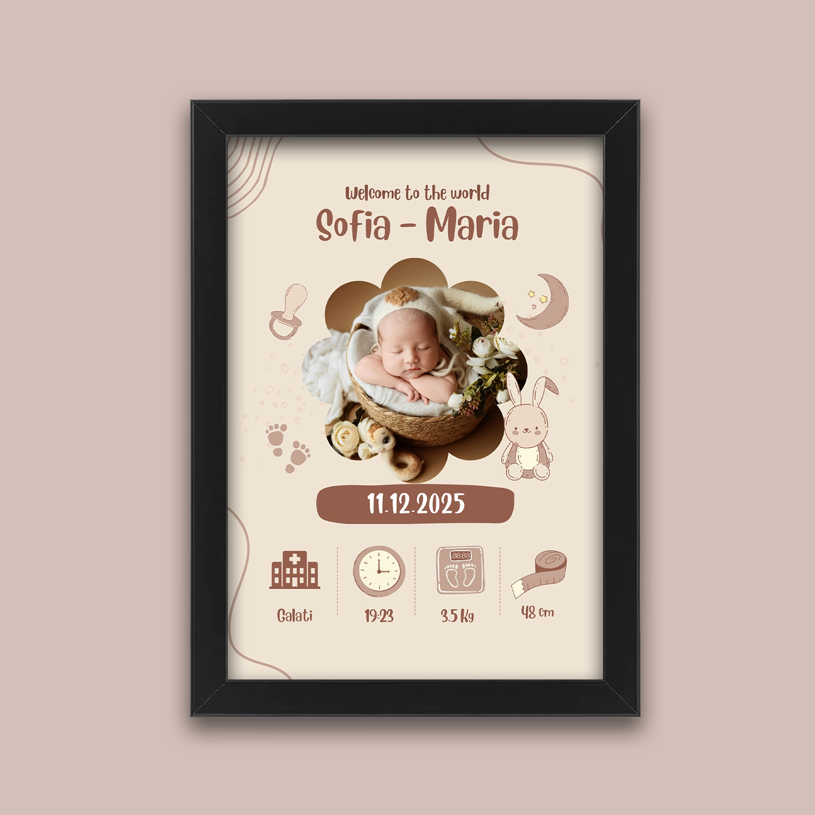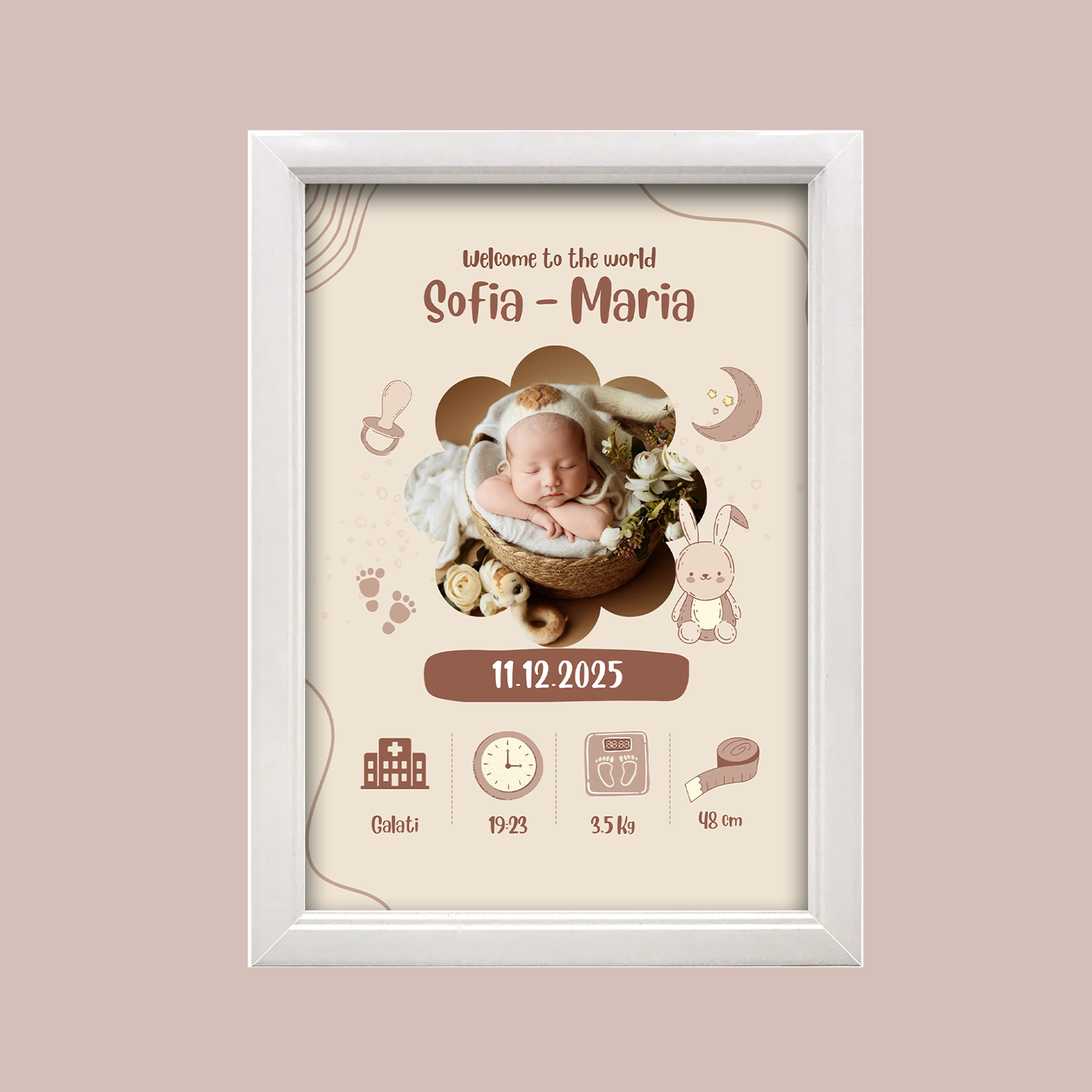 Poate include numele copilului, data nașterii, ora, greutatea și alte detalii importante.