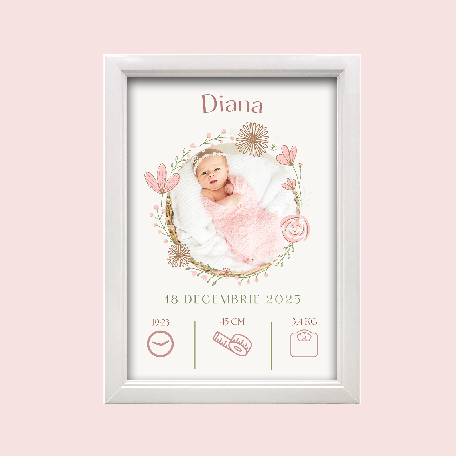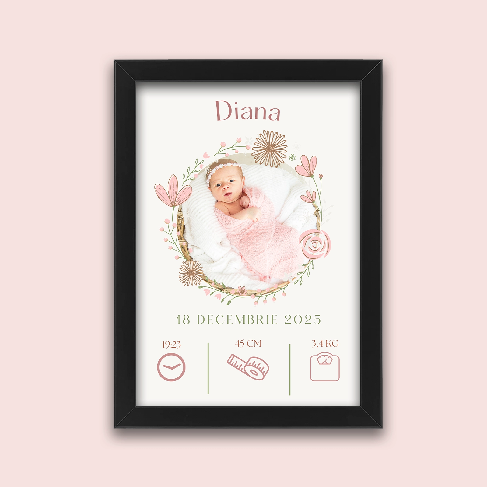 Creează un decor delicat și plin de emoție în camera bebelușului cu acest tablou pentru nou-născut, realizat într-un model floral roz, cu accente fine și romantice. Nuanțele calde de roz și ilustrațiile florale atent realizate transmit gingășie și armonie, fiind perfecte pentru un spațiu dedicat celor mai frumoase începuturi.