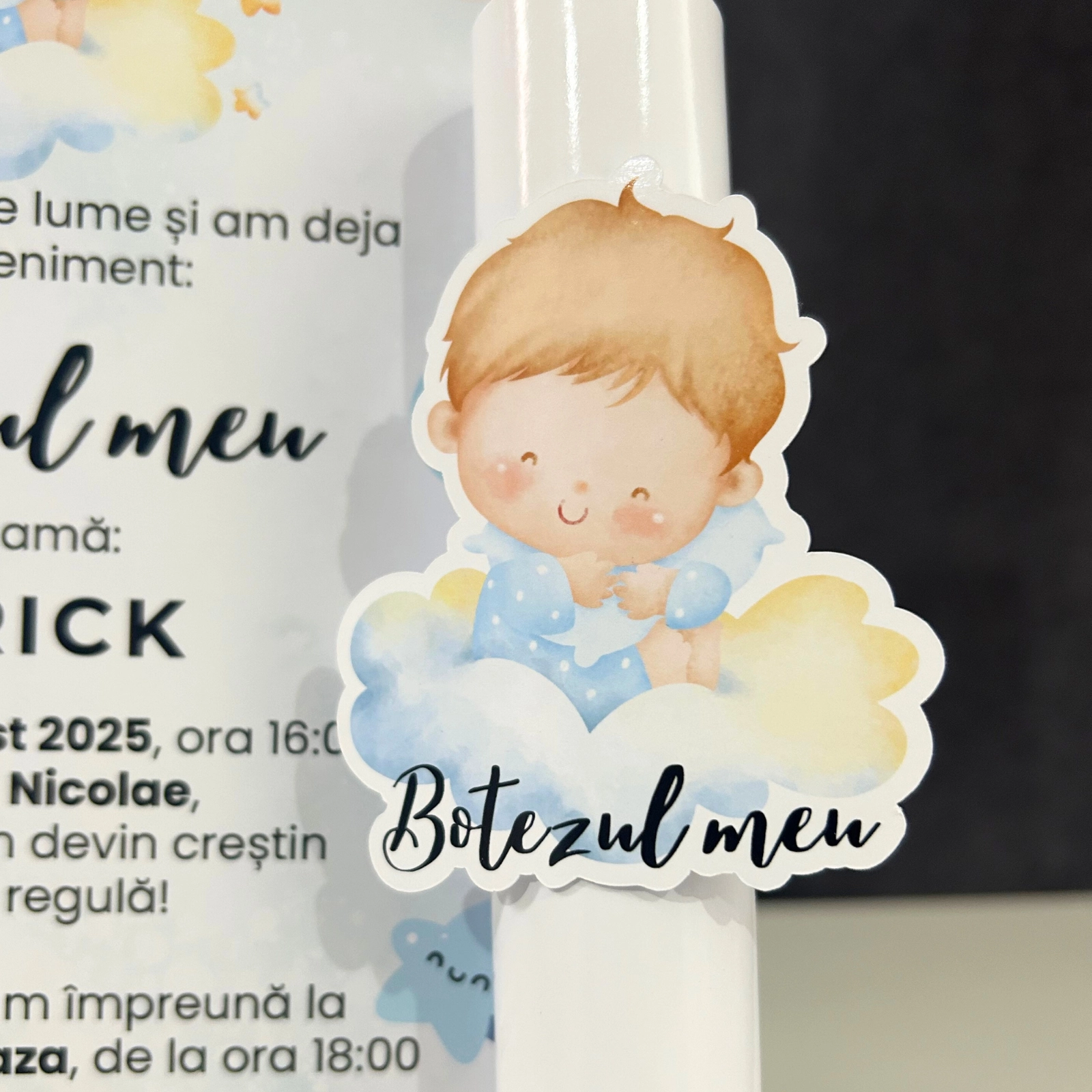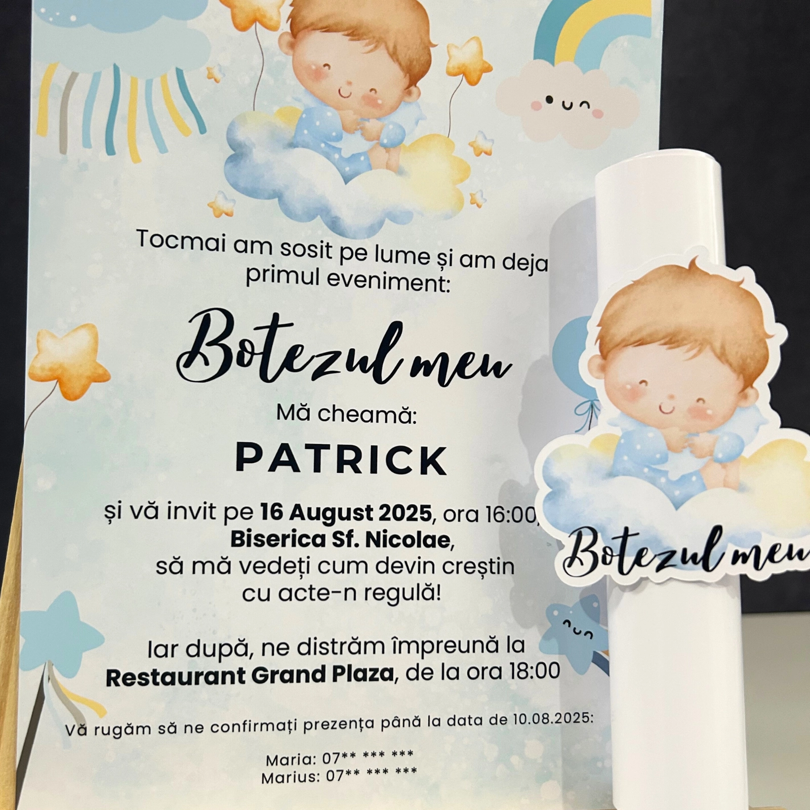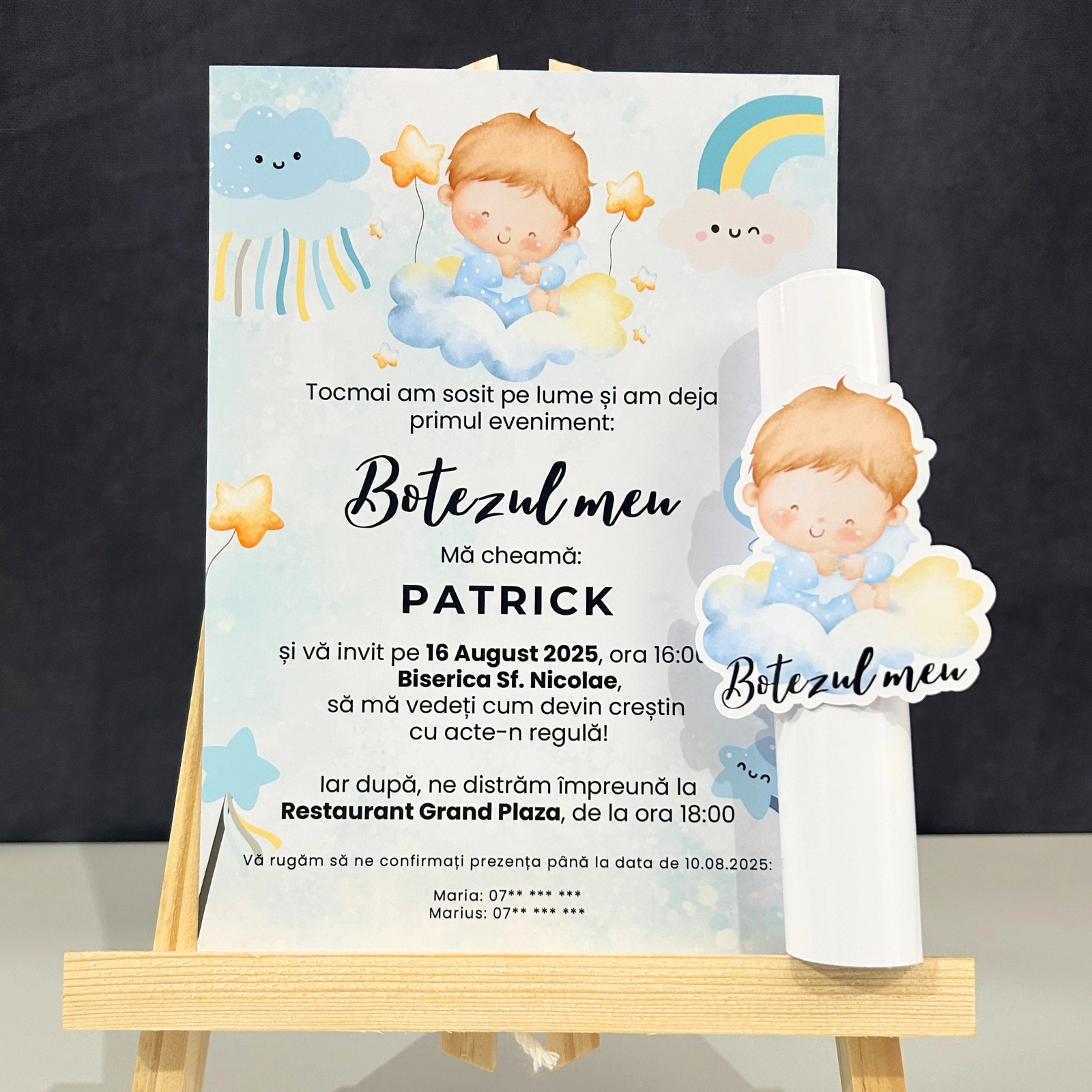 Culoarea principală este un albastru, simbol al calmului și purității, perfectă pentru sărbătorirea unui băiețel. Invitația este tipărită pe un material fin și de calitate, iar prezentarea – rulată și fixată cu o etichetă decorativă cu ilustrație – adaugă un plus de rafinament și originalitate.