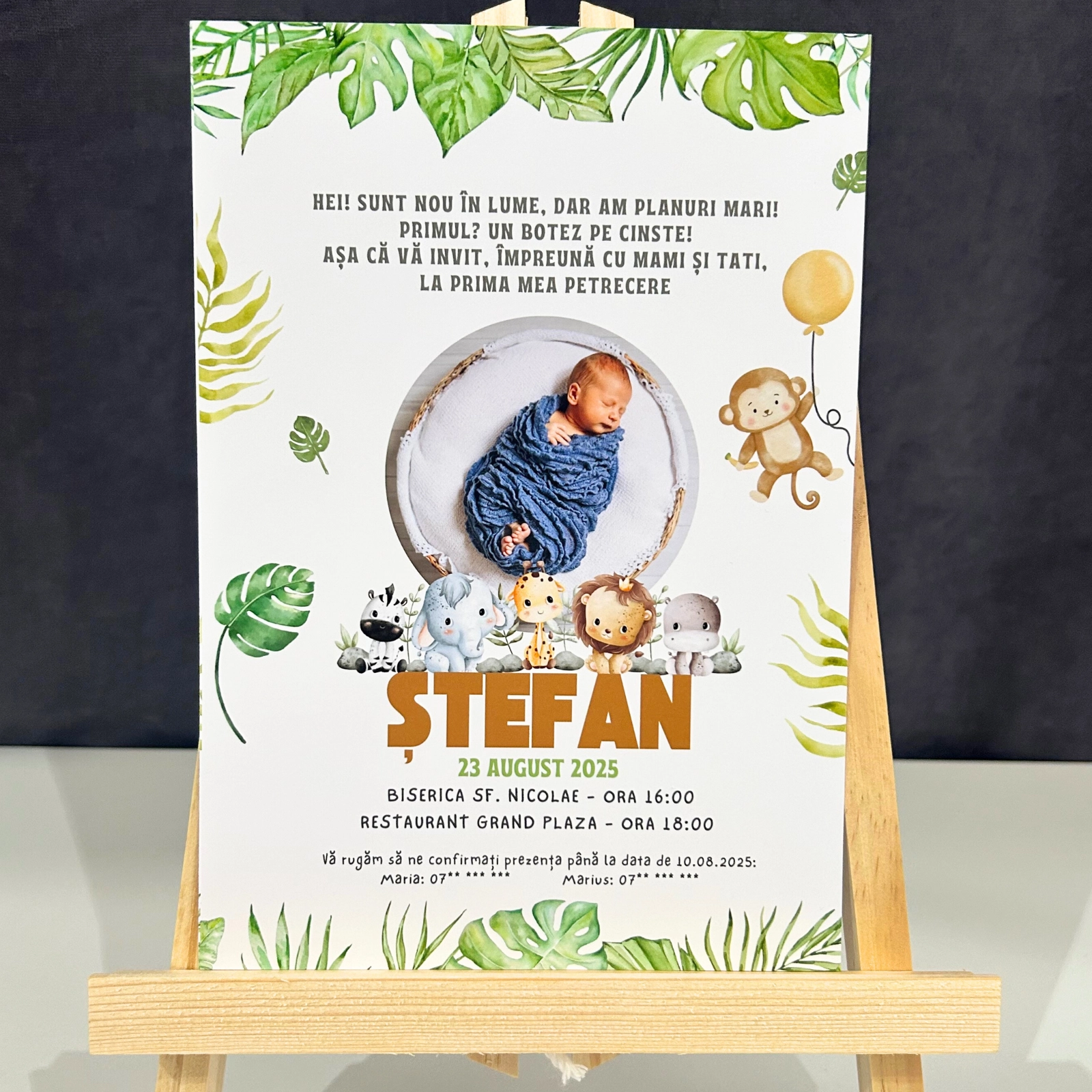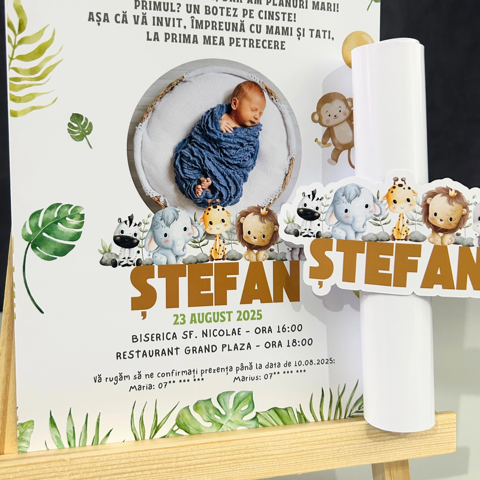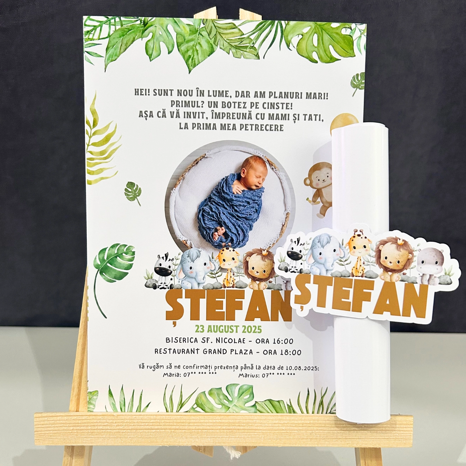 O invitație care spune povestea bebelușului tău chiar din primul rând! Cu un design jucăuș, plin de desene colorate și detalii vesele, această invitație papirus este personalizată cu poza micuțului și un text creat special pentru voi.