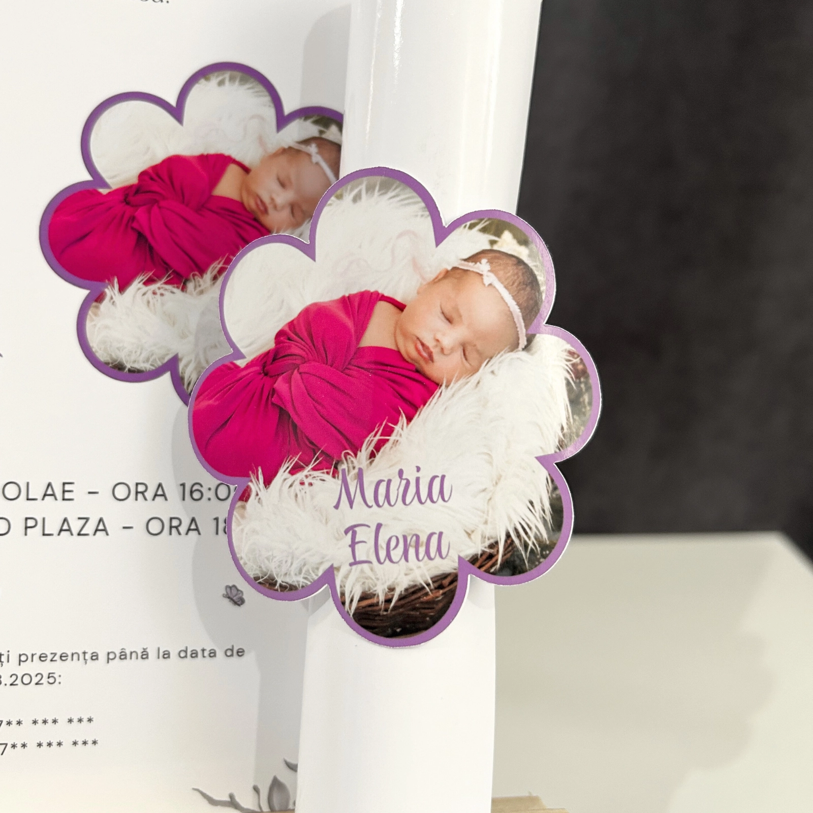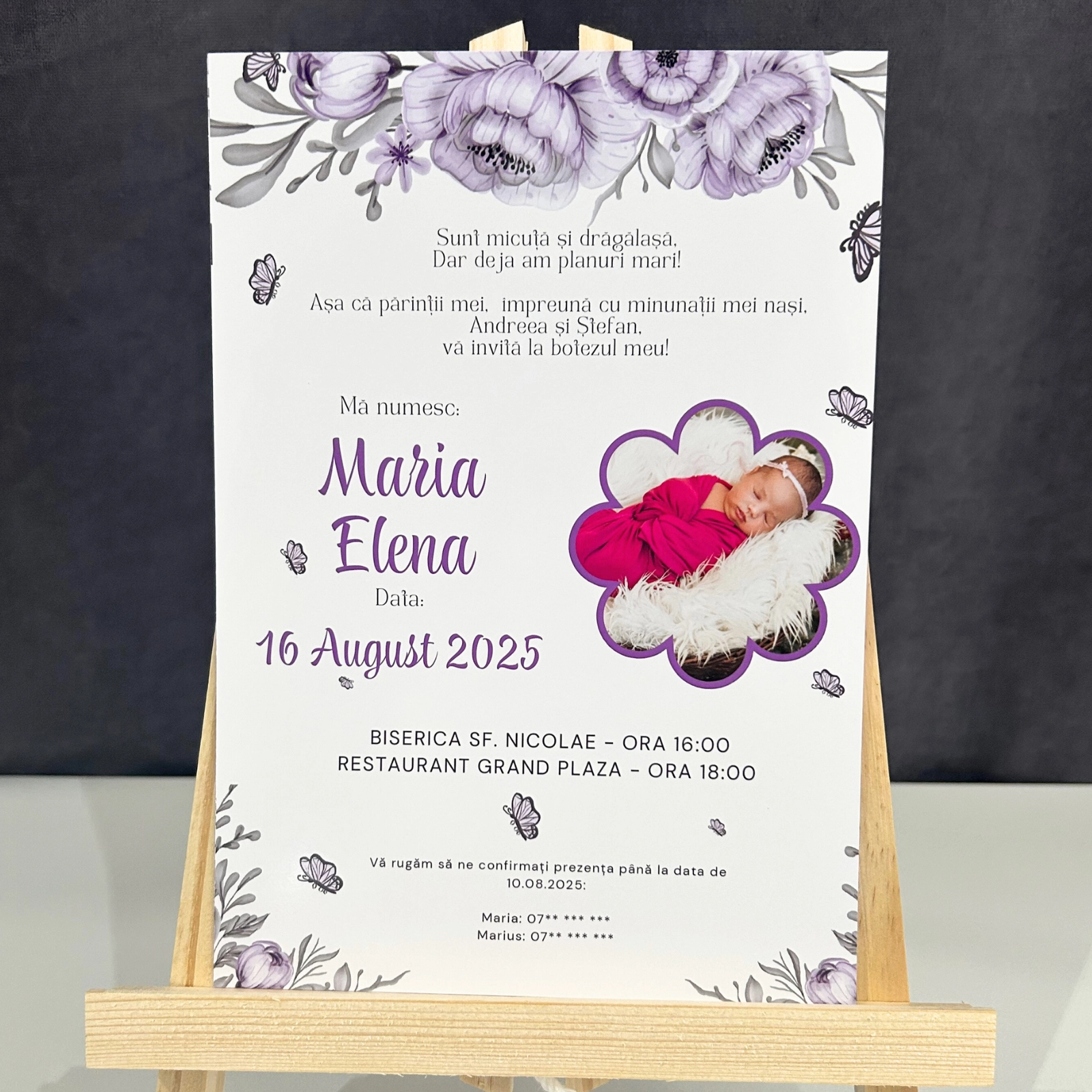 Culoarea principală este mov, simbol al blândeții și gingășiei, perfectă pentru o fetiță. Invitația este tipărită pe hârtie de calitate, iar modul inedit de prezentare – rulat și fixat cu eticheta decorativă cu poză – adaugă un plus de rafinament și originalitate.