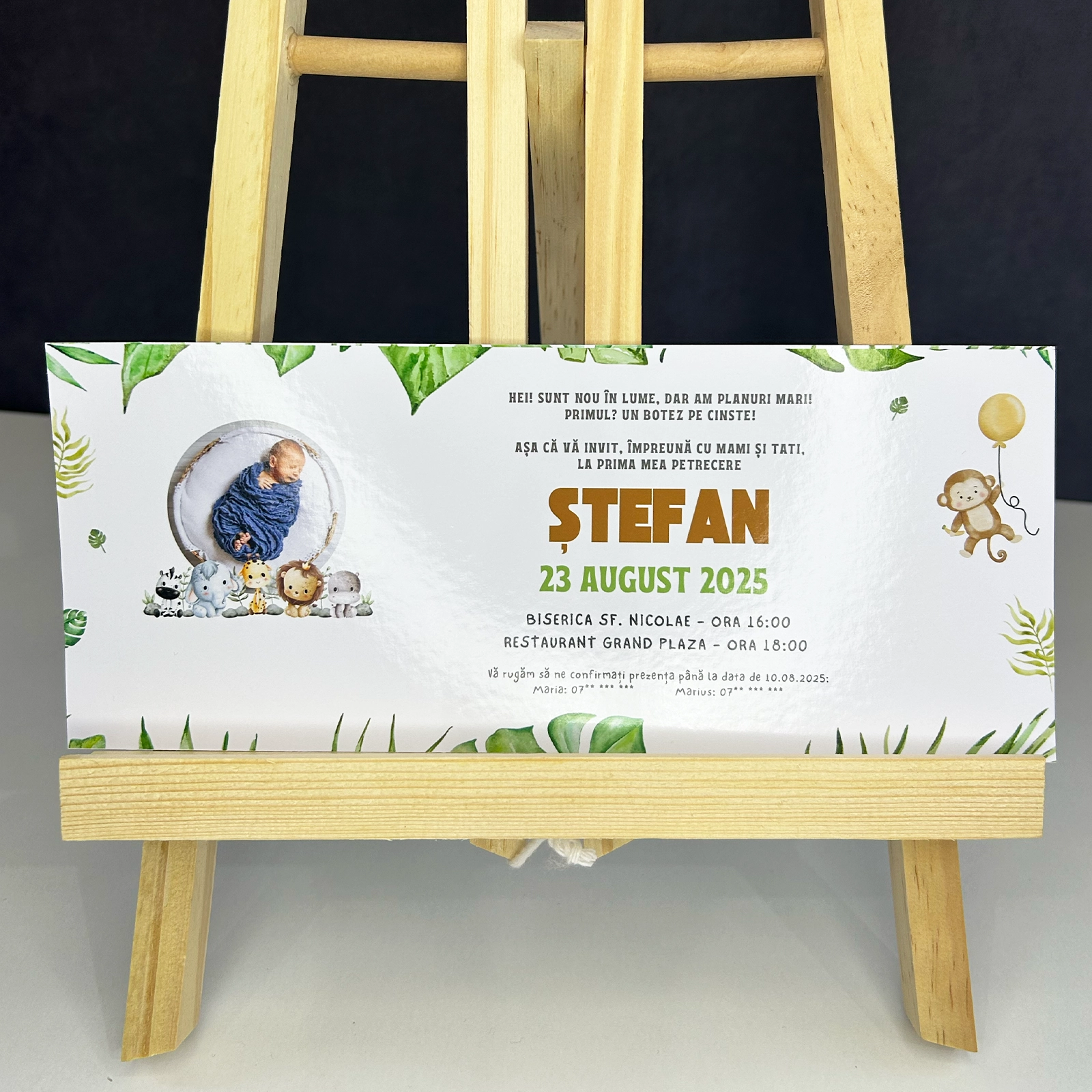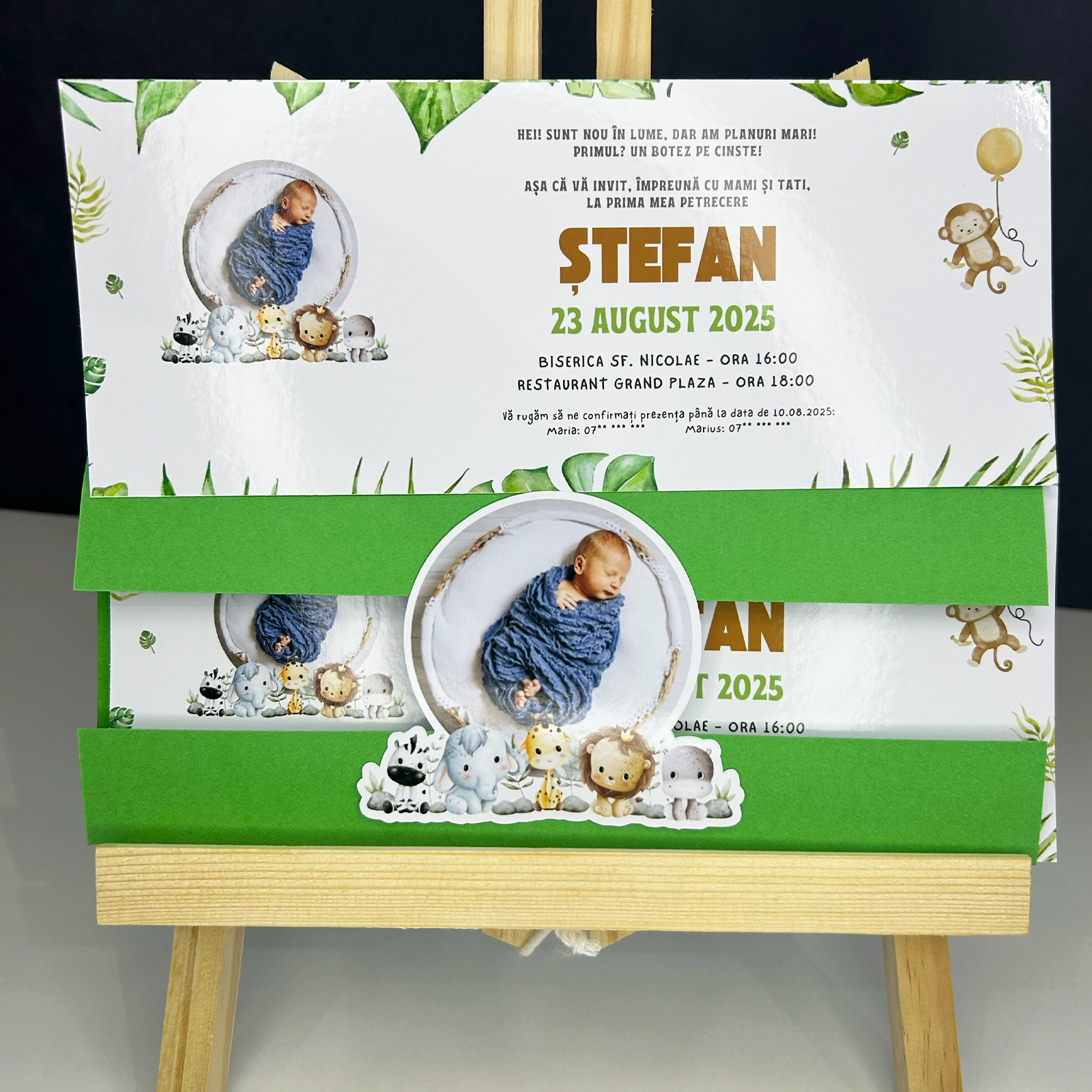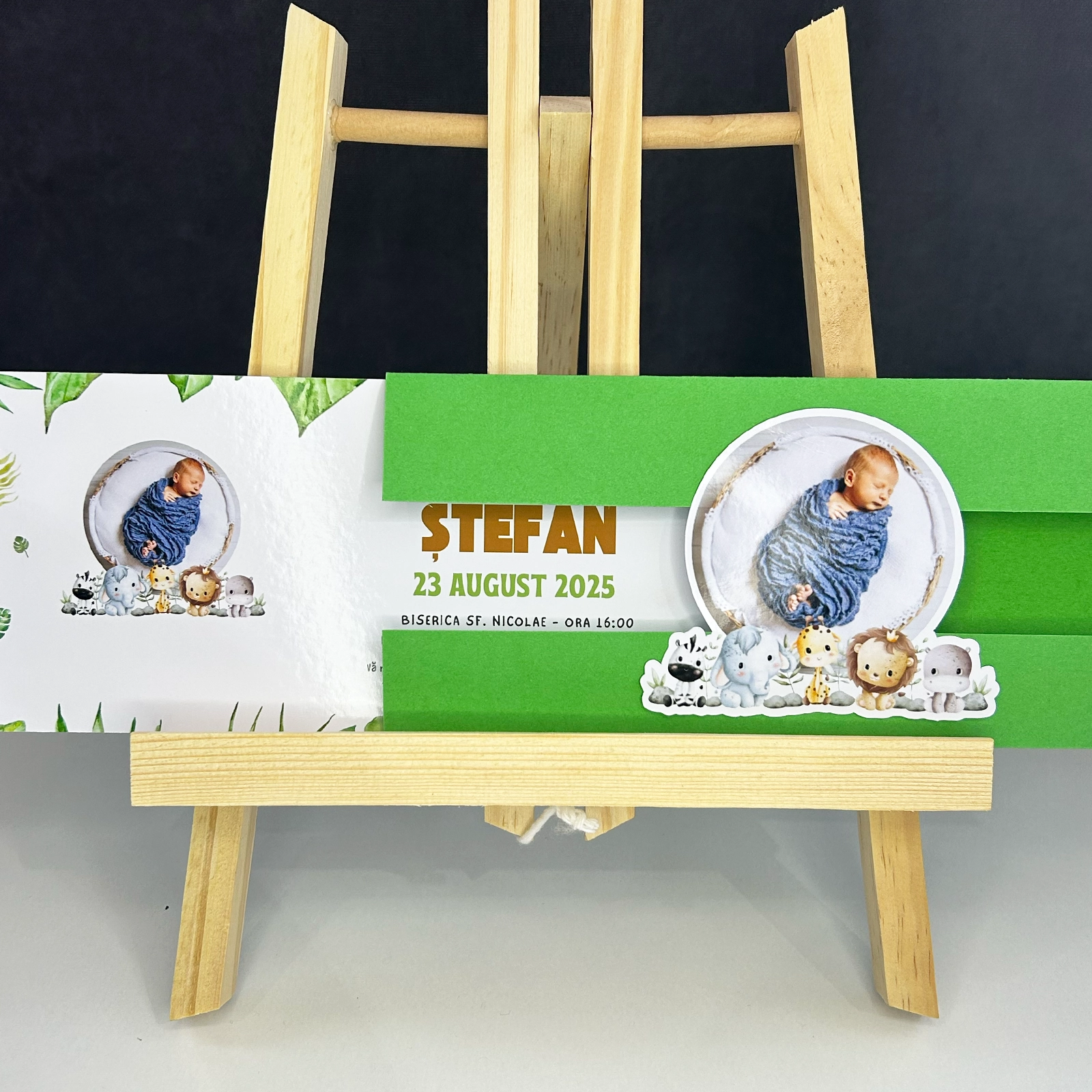 Tocul verde, elegant și modern, încadrează invitația într-un mod armonios, oferind un aspect îngrijit și festiv. Stickerul decorativ cu poza bebelușului completează perfect prezentarea și poate fi folosit pentru sigilarea tocului sau ca mic detaliu de efect în decorul evenimentului.