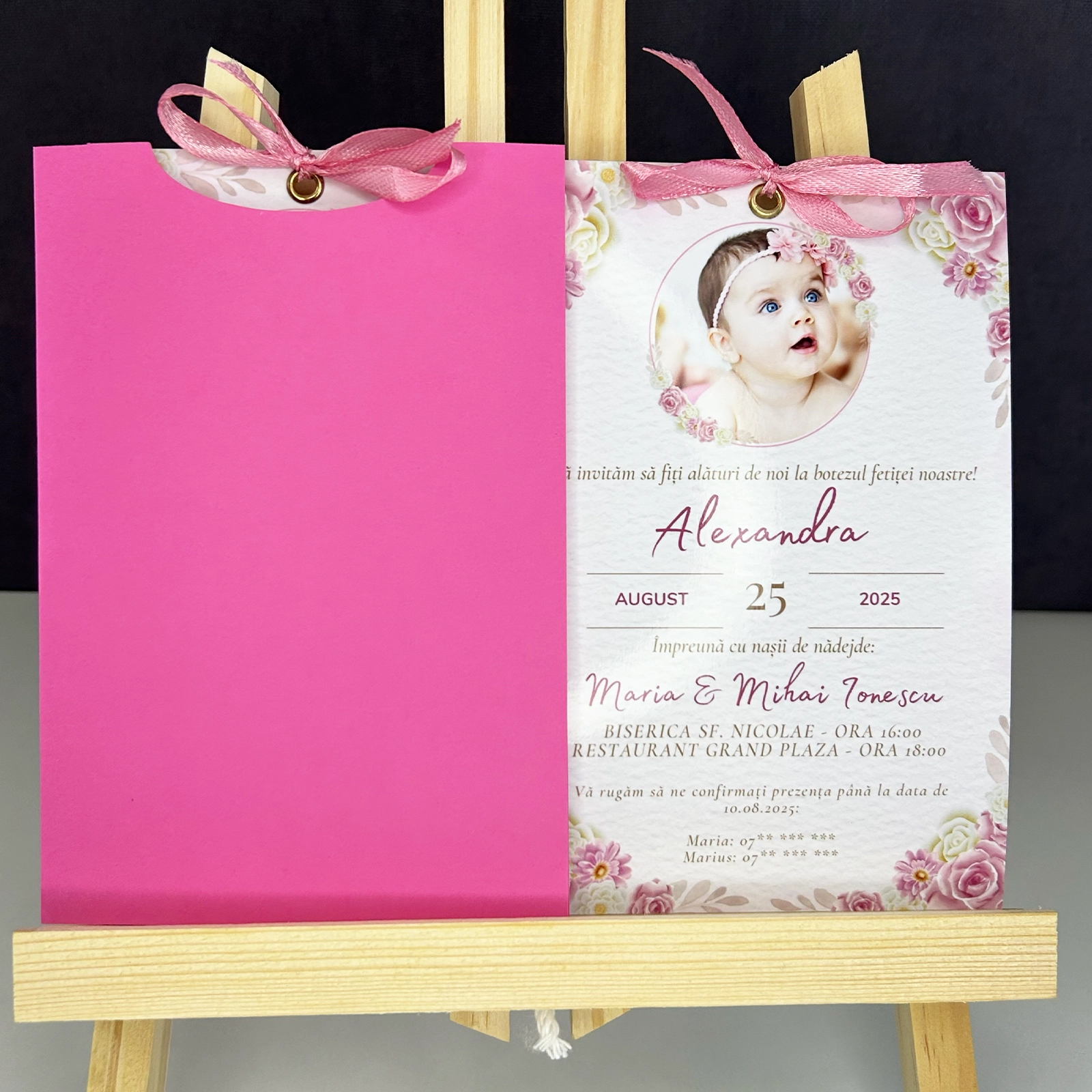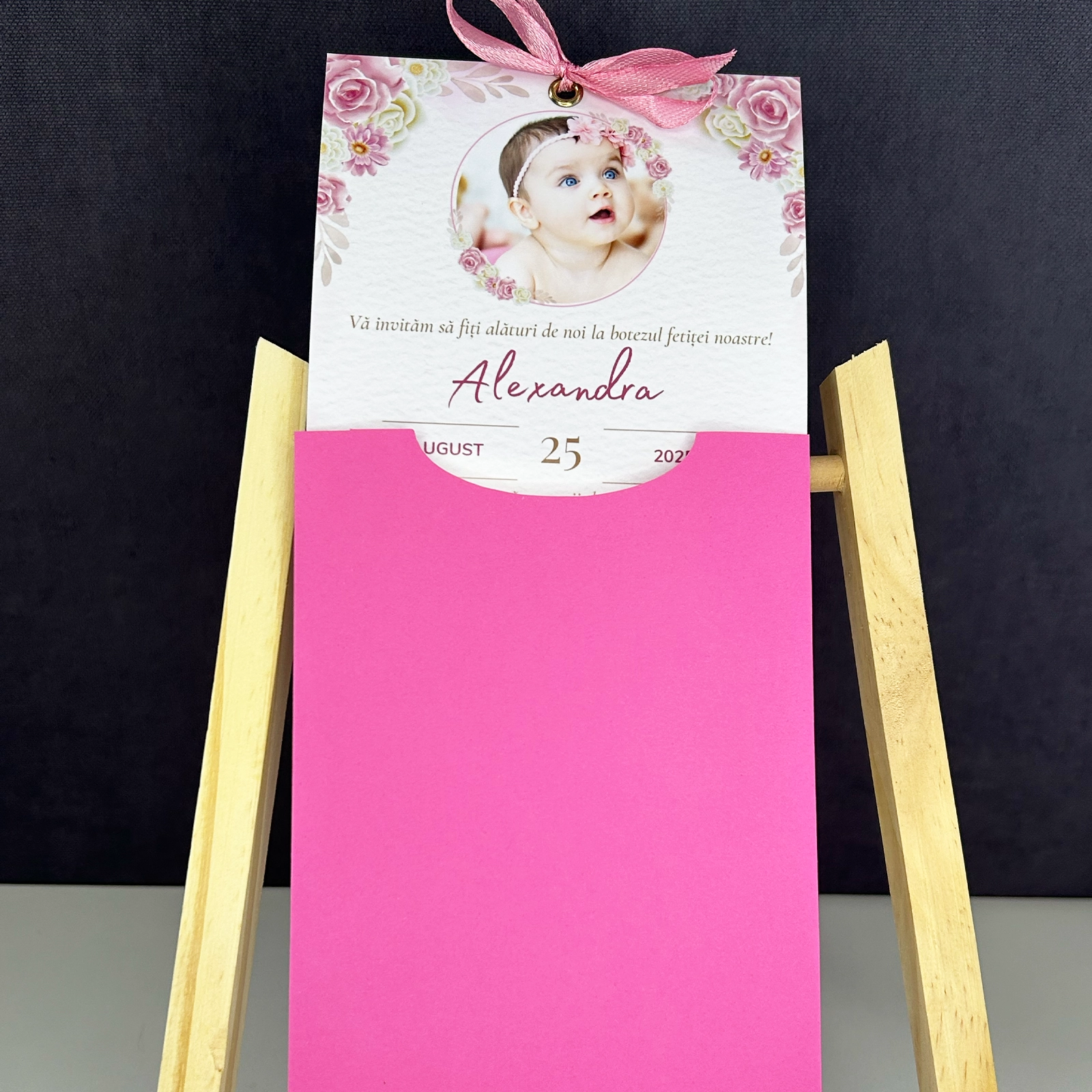 Invitația de botez cu poză și plic roz este o opțiune rafinată și plină de emoție pentru a marca debutul unei noi povești de viață. Personalizată cu fotografia bebelușului, această invitație adaugă o notă unică și personală fiecărui exemplar.