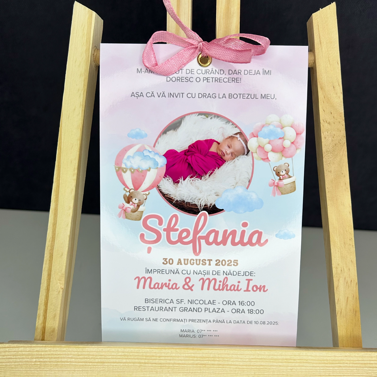 Personalizată cu fotografia bebelușului și ilustrată cu un ursuleț adorabil, invitația transmite gingășie și bucurie încă de la prima privire.