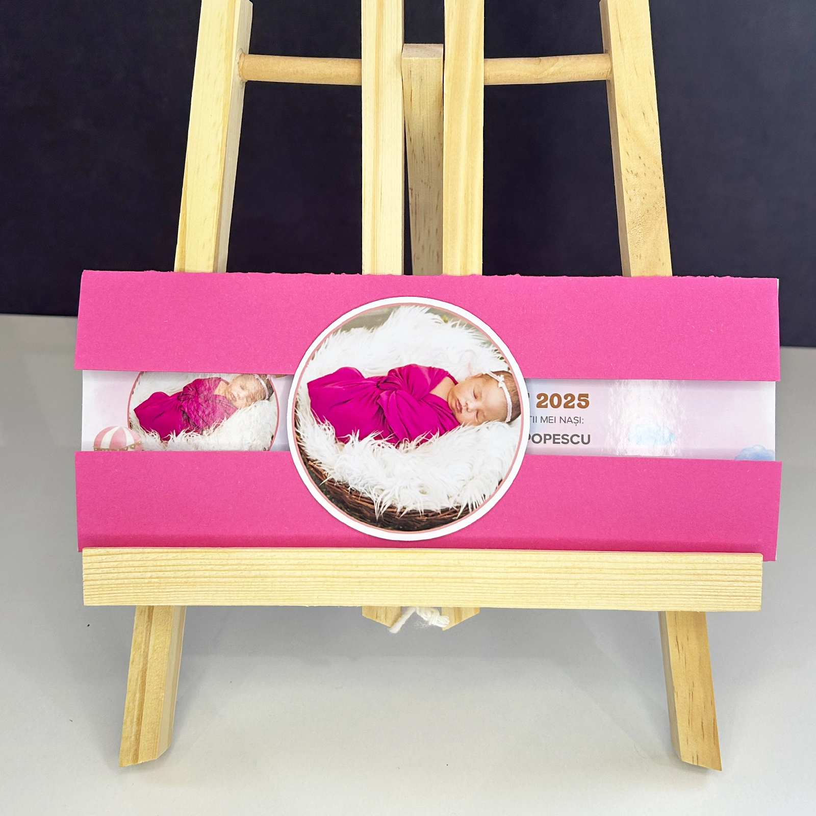 Elementul central este fotografia bebelușului, care personalizează invitația într-un mod unic și memorabil. Fiecare detaliu este gândit cu grijă: invitația vine însoțită de un toc roz elegant și un sticker decorativ pe care este imprimată aceeași poză, pentru un plus de coerență vizuală și rafinament.