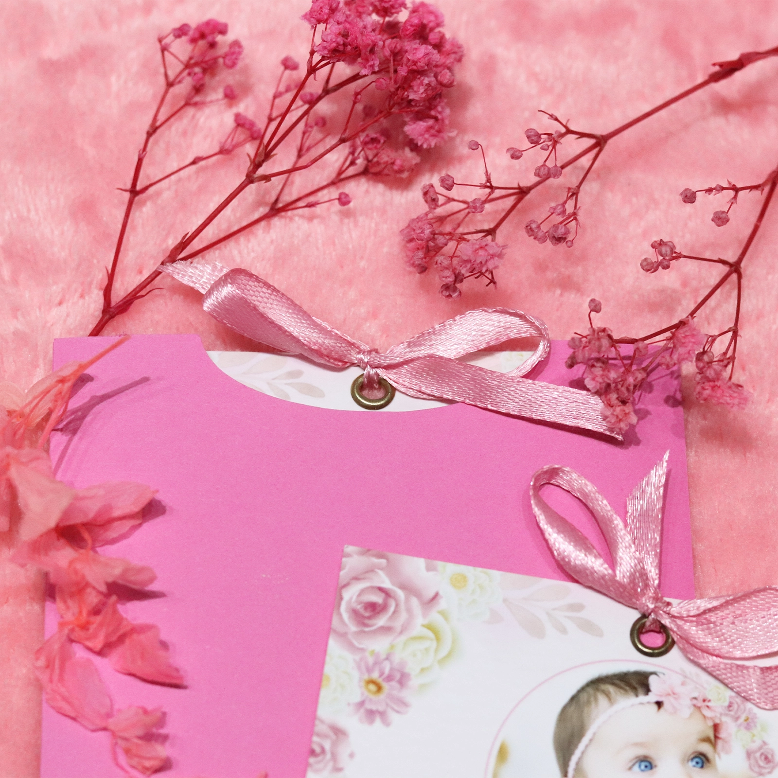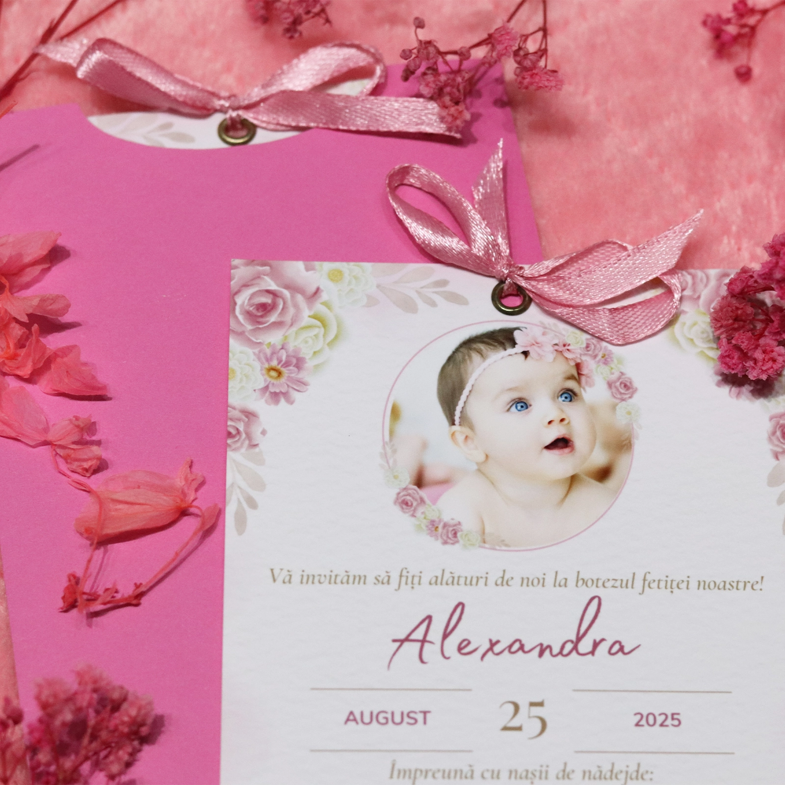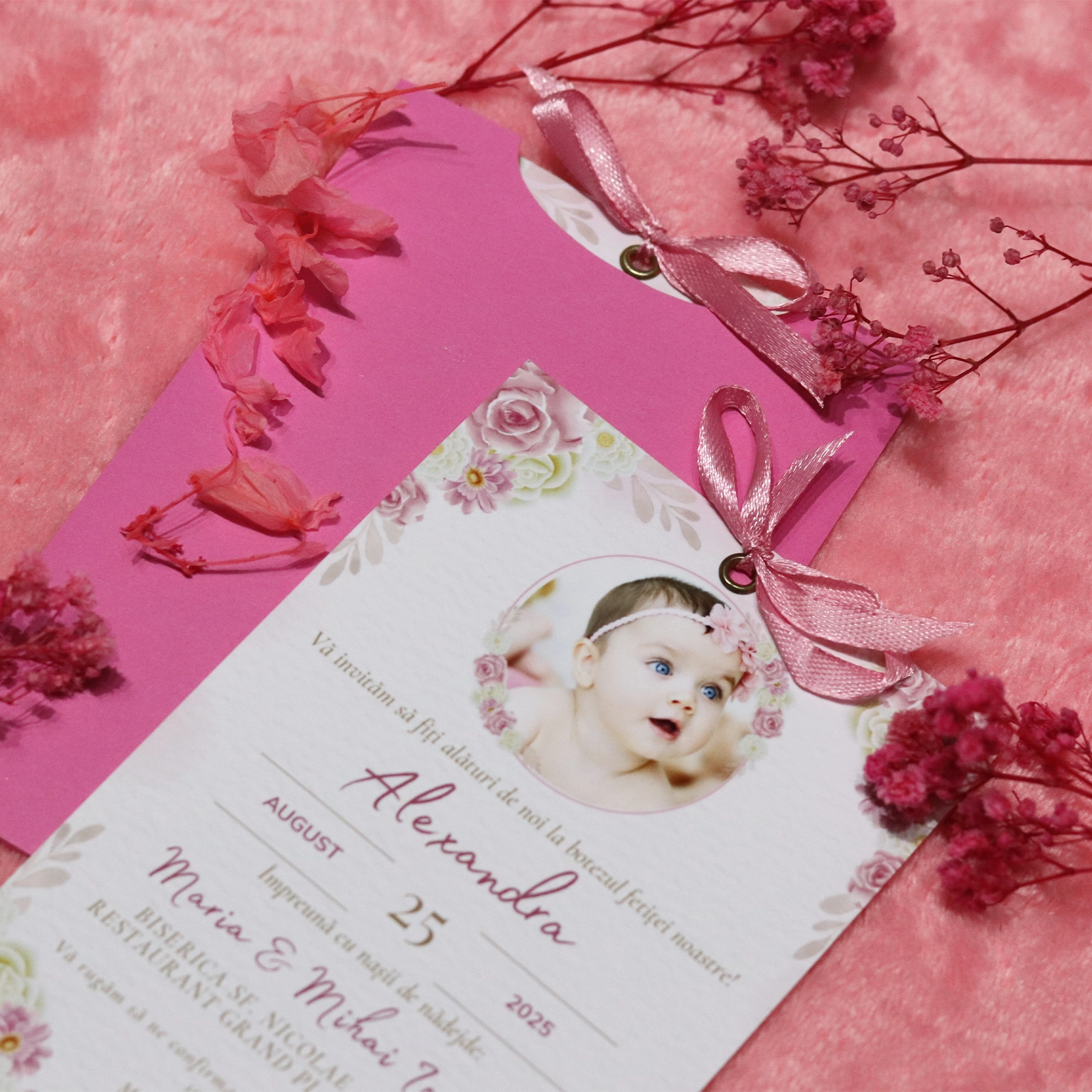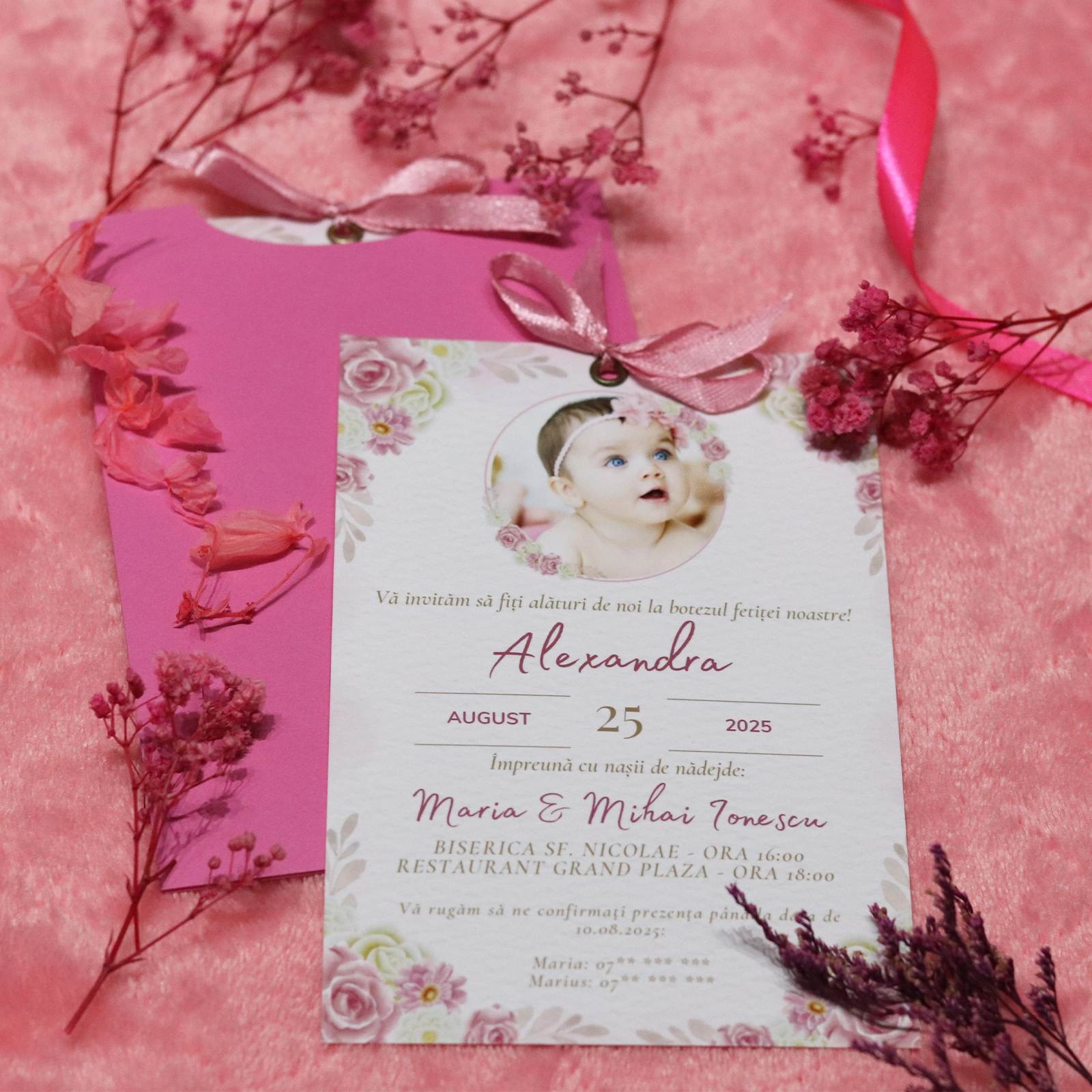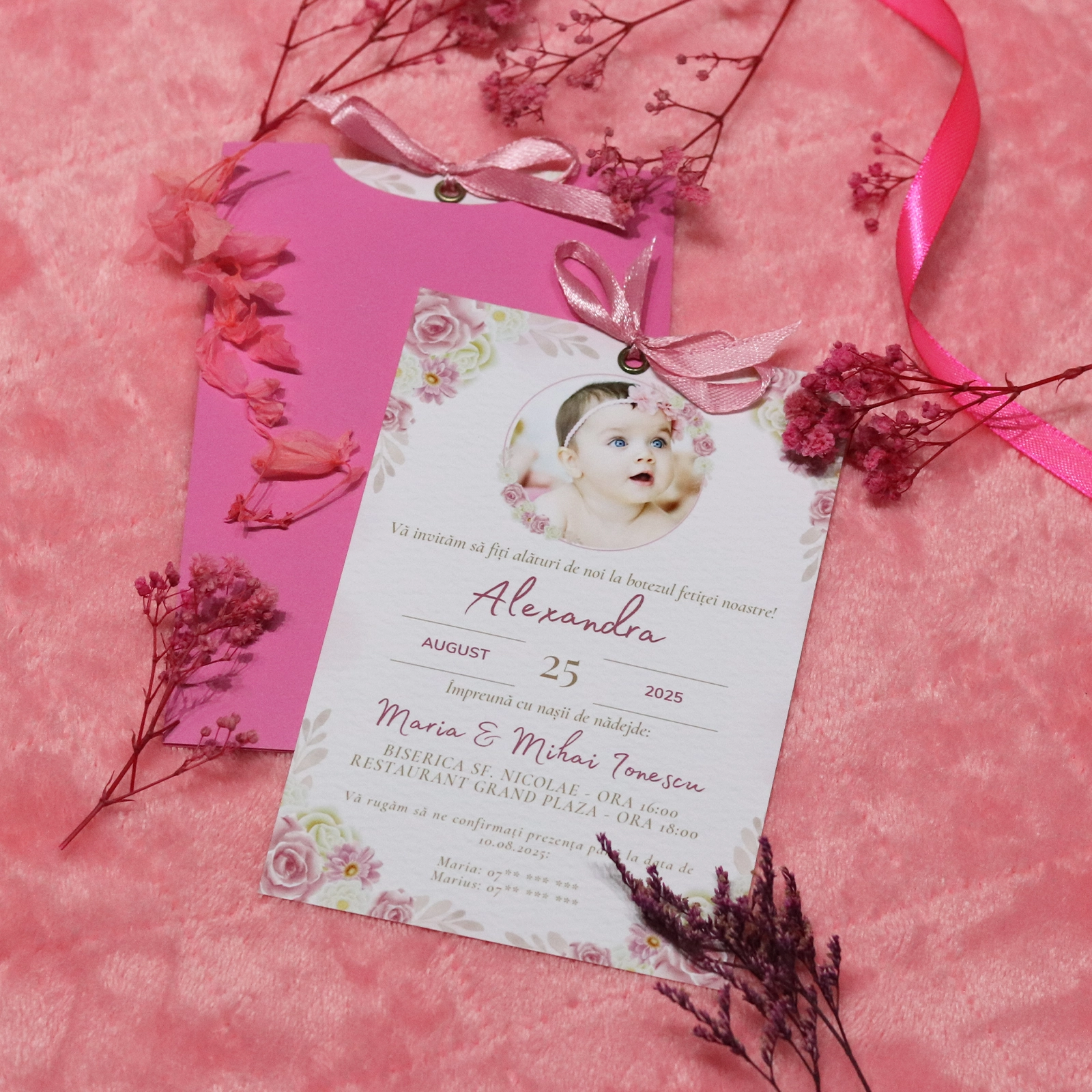 Invitația de botez cu poză și plic roz este o opțiune rafinată și plină de emoție pentru a marca debutul unei noi povești de viață. Personalizată cu fotografia bebelușului, această invitație adaugă o notă unică și personală fiecărui exemplar.