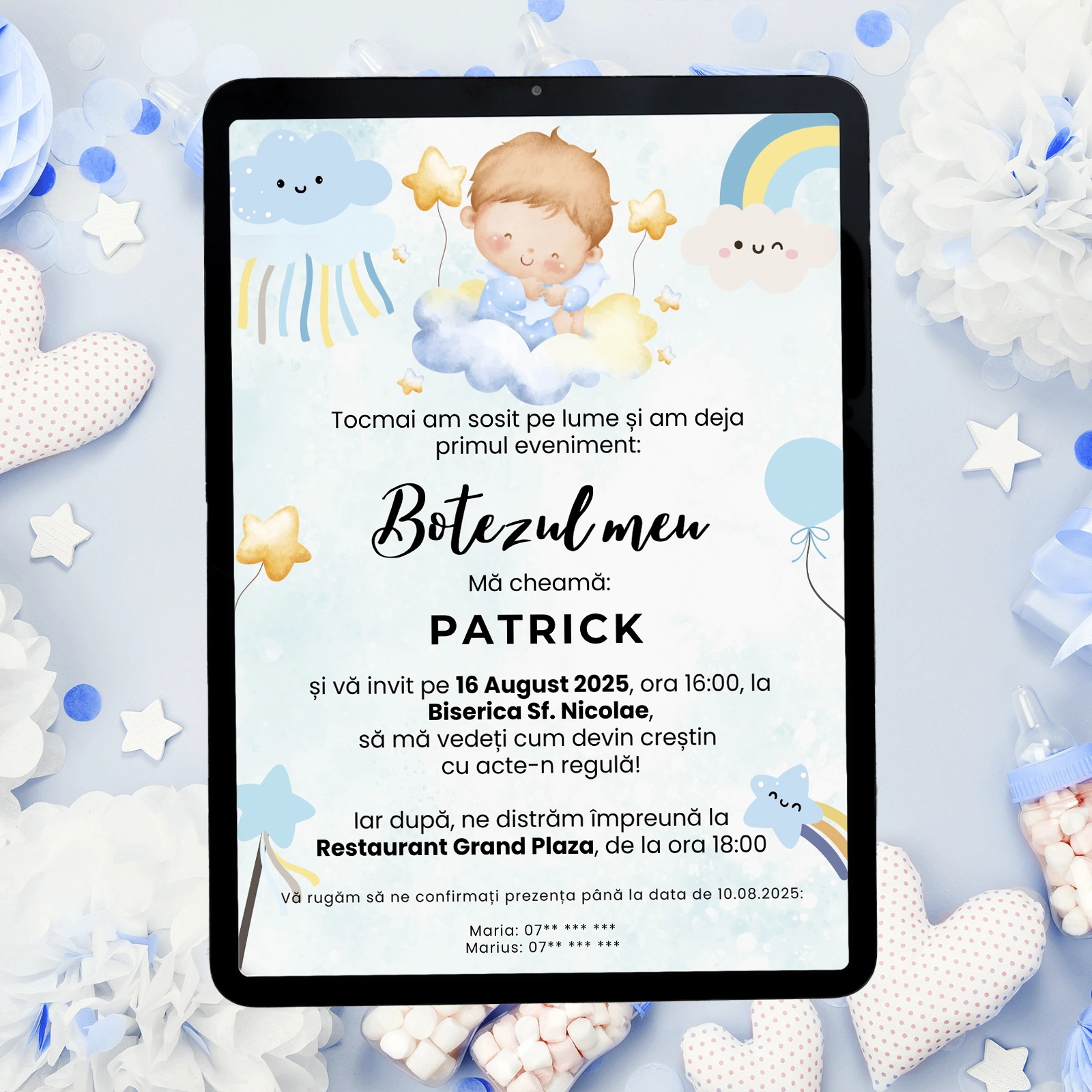 Toate invitațiile pot fi personalizate cu numele bebelușului, data botezului, ora și locul slujbei, detalii despre petrecere, confirmare de participare (RSVP), dar și un mesaj personalizat pentru invitați.