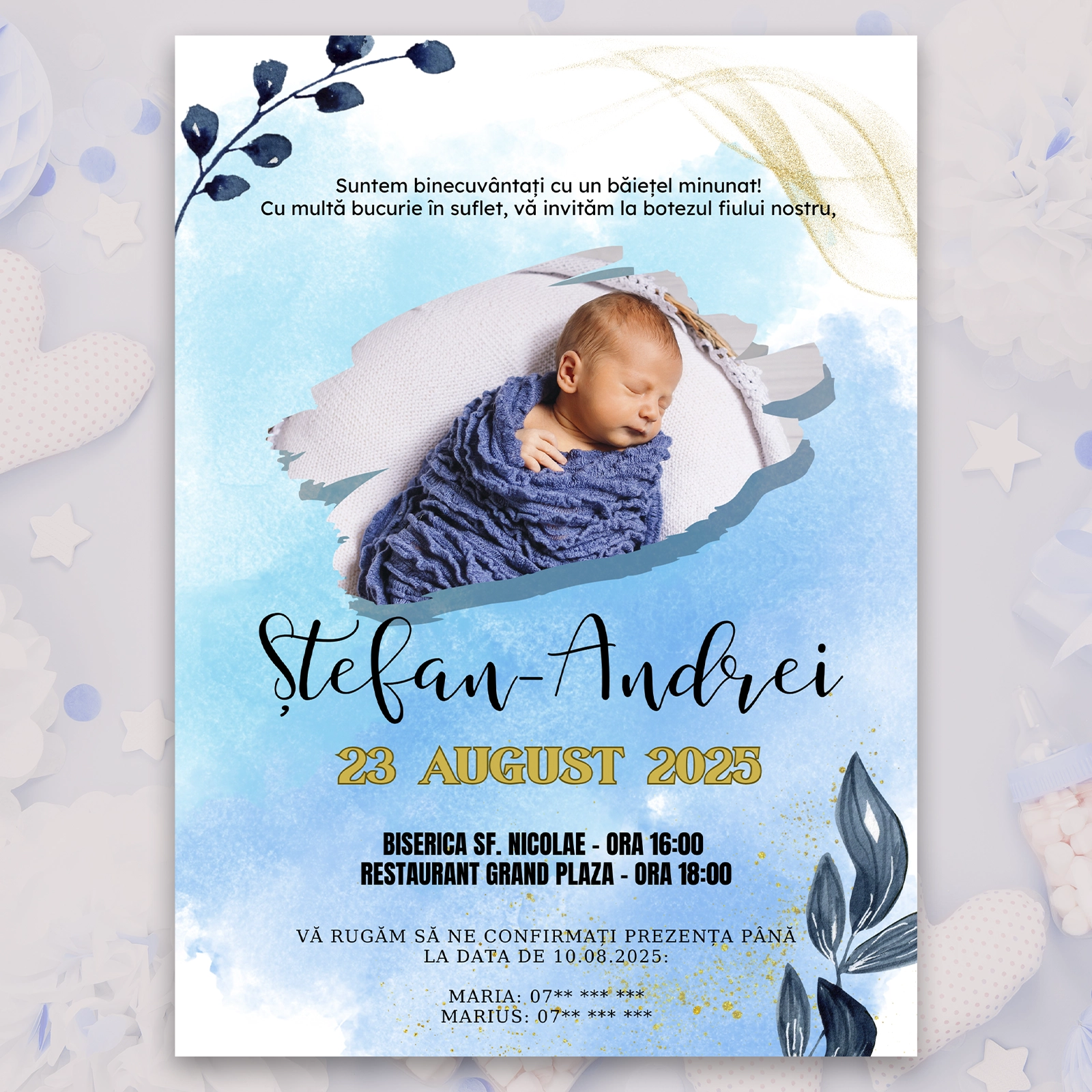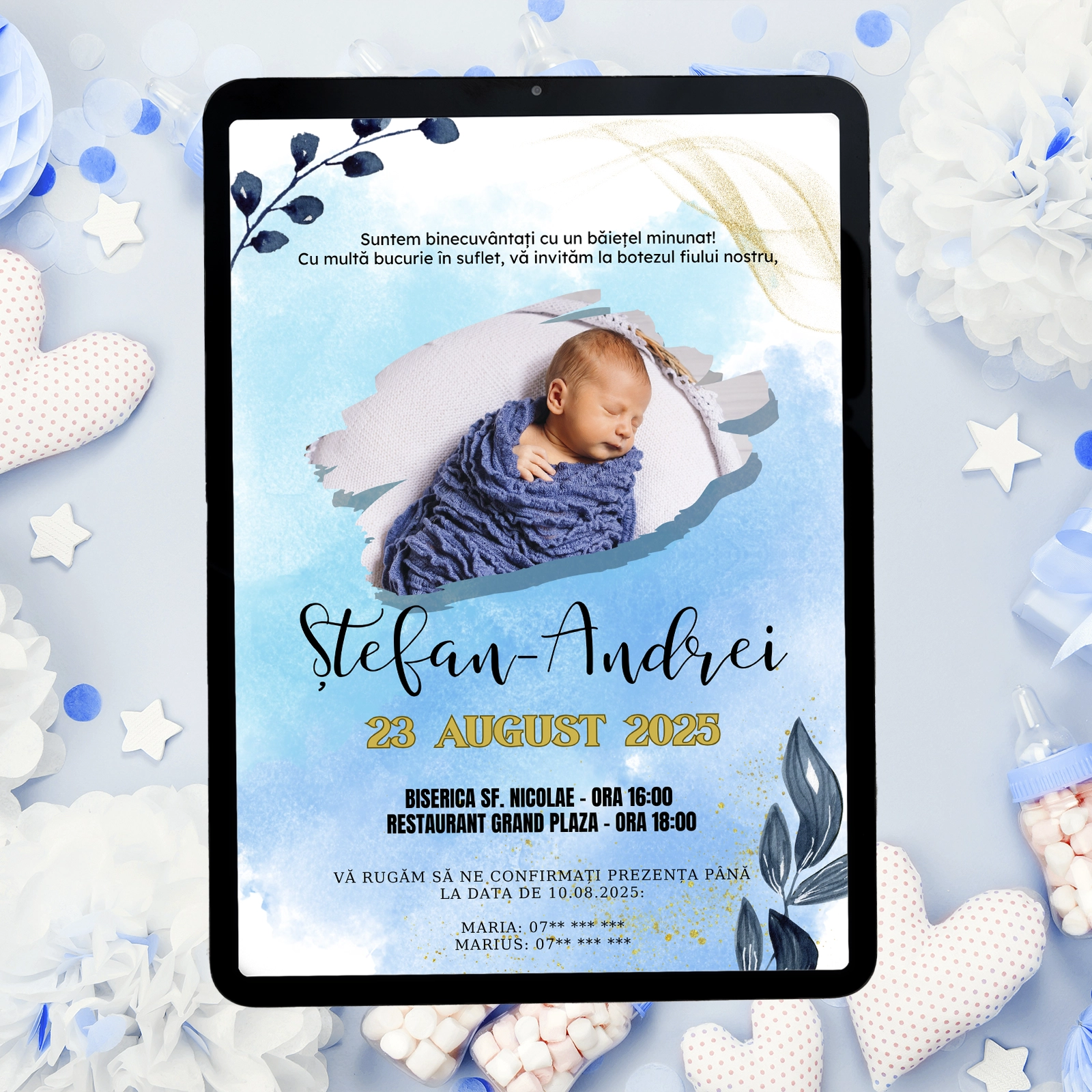 Anunță botezul băiețelului tău cu o invitație digitală elegantă și personală, în nuanțe senine de albastru pastel. Designul curat, delicat și modern este completat perfect de fotografia micuțului, adăugând un strop de emoție și unicitate momentului.
