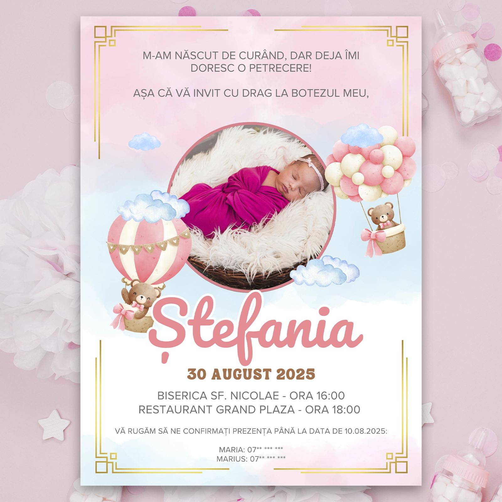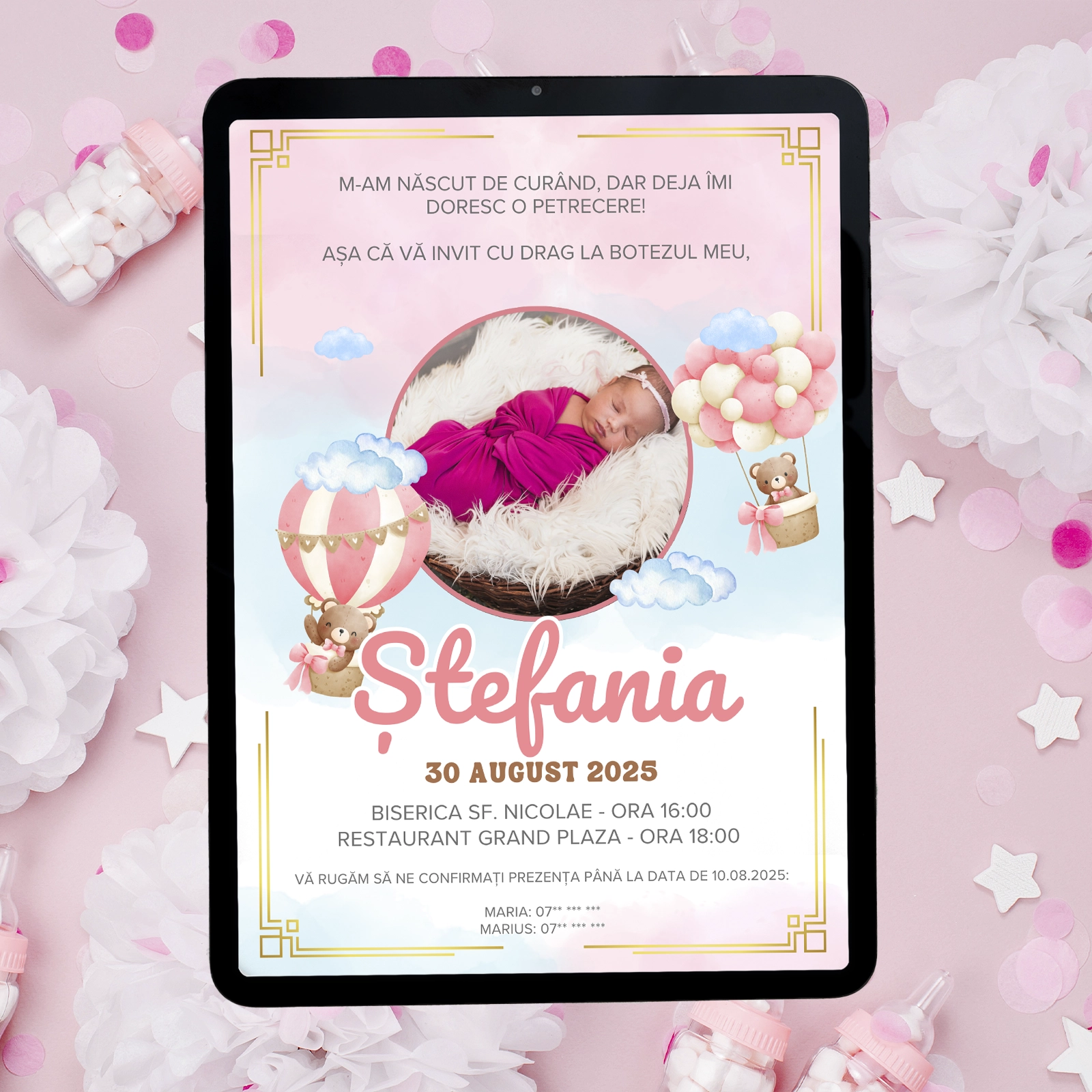 O invitație plină de tandrețe pentru cel mai dulce moment din viața familiei tale. Acest model digital combină ilustrații simpatice cu ursuleți și o fotografie adorabilă a fetiței, creând un design jucăuș, dar și emoționant, care va topi inimile invitaților.