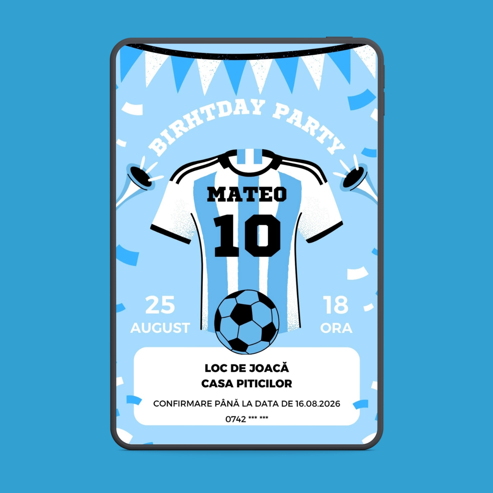 Invitația digitală albastră de zi de naștere fotbal este alegerea ideală pentru o petrecere tematică memorabilă.