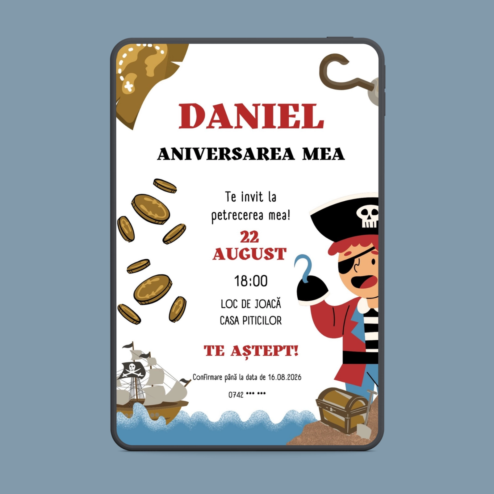 Invitația digitală de zi de naștere cu pirat este alegerea ideală pentru o petrecere tematică memorabilă.