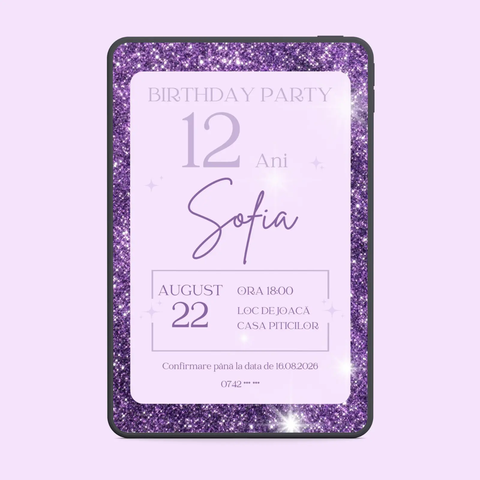 Invitația digitală de zi de naștere mov este alegerea ideală pentru un eveniment organizat simplu, rapid și cu stil.