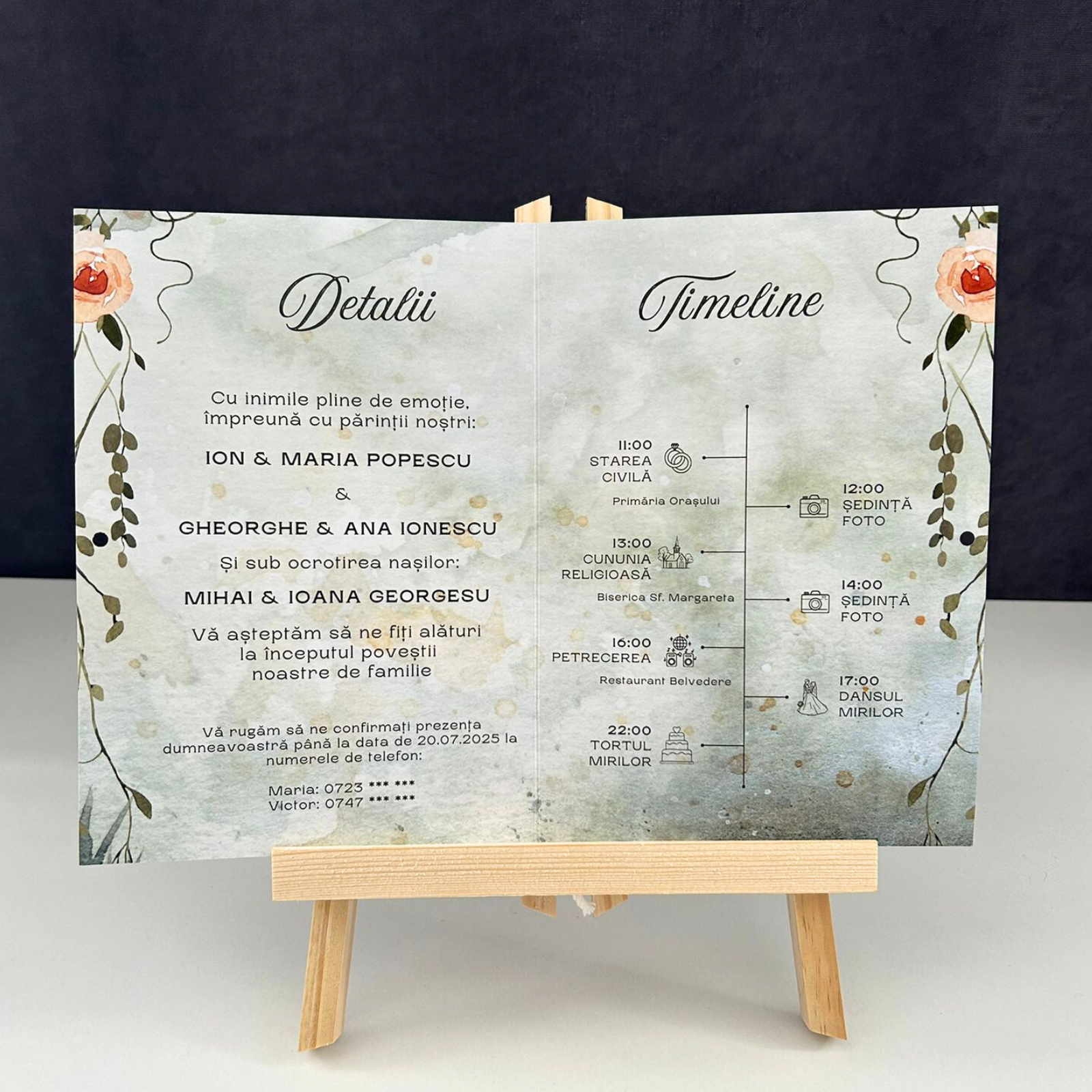 Celebrați dragostea voastră într-un mod unic cu această invitație pliabilă, în care mirele și mireasa sunt capetele de afiș ale designului. 🎉 Fiecare detaliu este gândit pentru a reflecta frumusețea și emoția unui moment de neuitat.