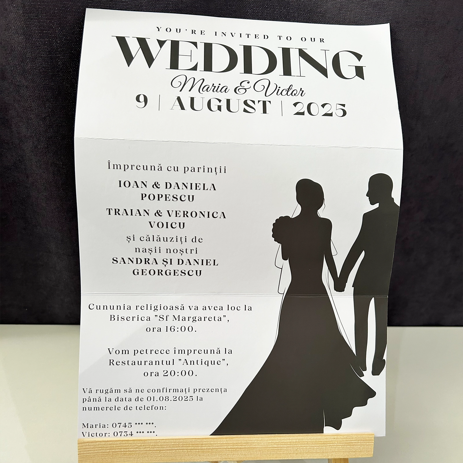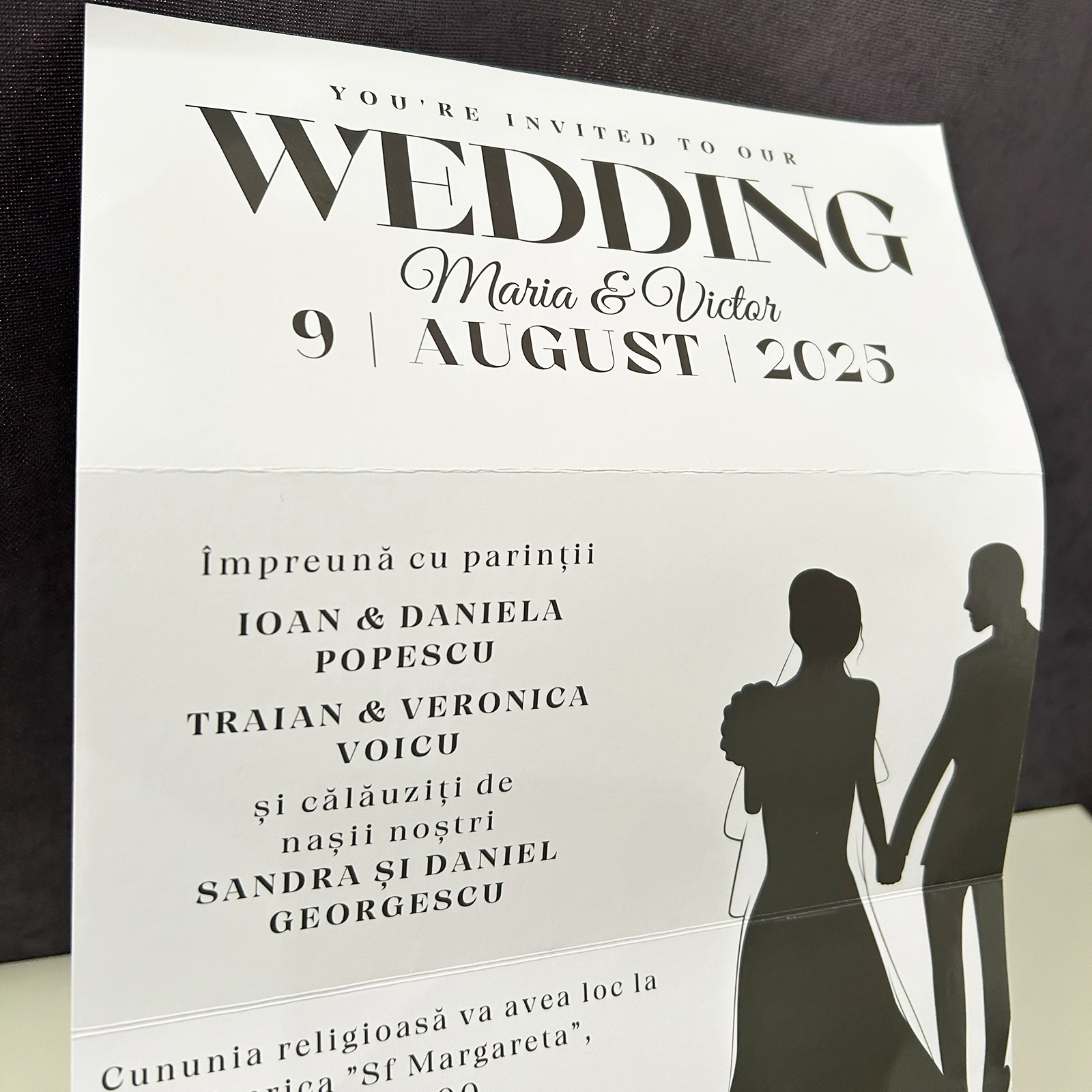 Această invitație pliabilă aduce un plus de romantism prin ilustrarea delicată a mirilor pe copertă – un detaliu simbolic ce anunță cu emoție ziua cea mare.