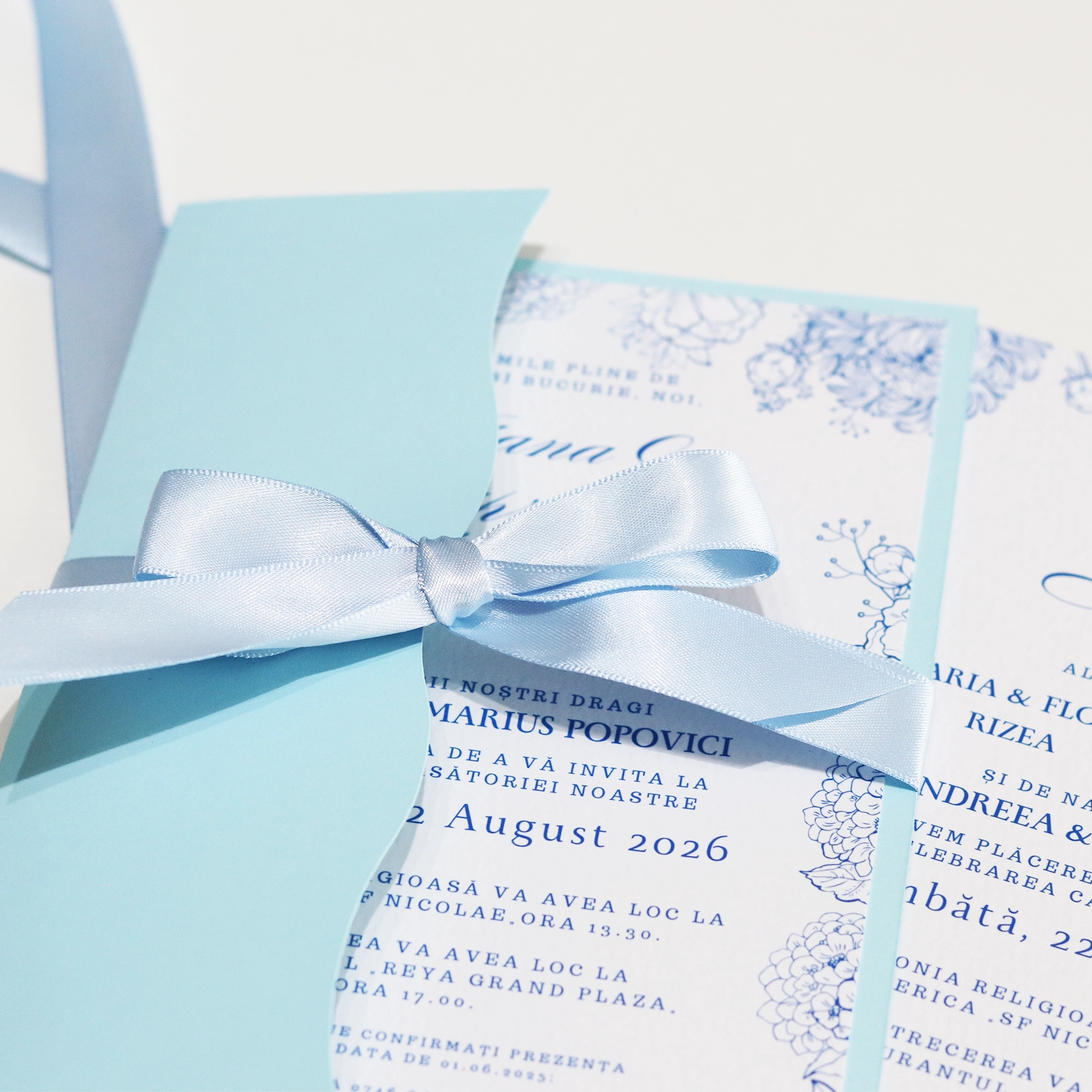 Completează atmosfera nunții cu o invitație rafinată, decorată cu un model floral delicat în nuanțe de albastru. Designul elegant și armonios conferă un aer distins și romantic, potrivit pentru nunți clasice, minimaliste sau contemporane.