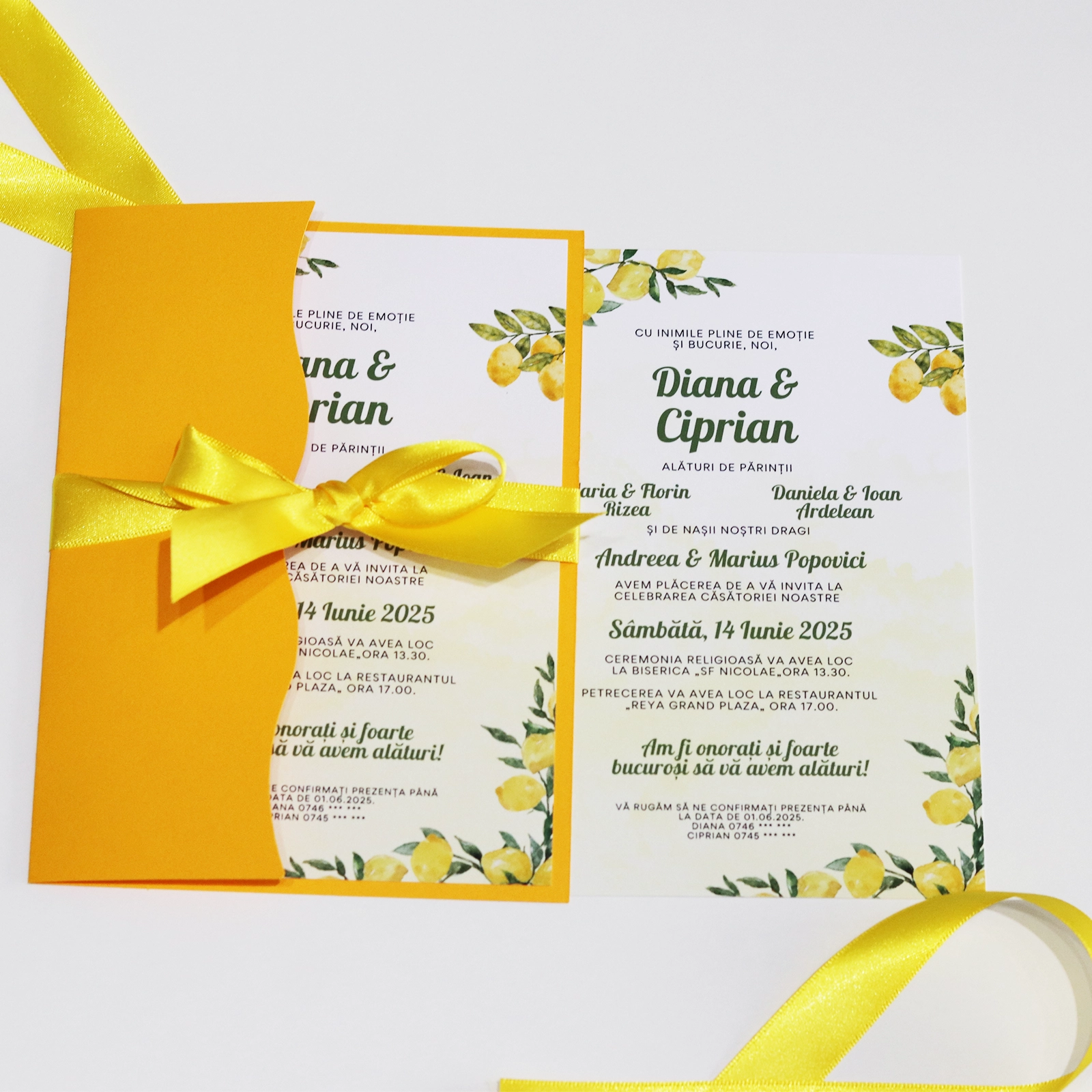 Completează atmosfera nunții cu o invitație proaspătă și rafinată, decorată cu un model delicat de lămâi. Designul modern și luminoasele accente galbene oferă un aer elegant și vesel, potrivit pentru nunți romantice, de vară sau cu tematică fresh.