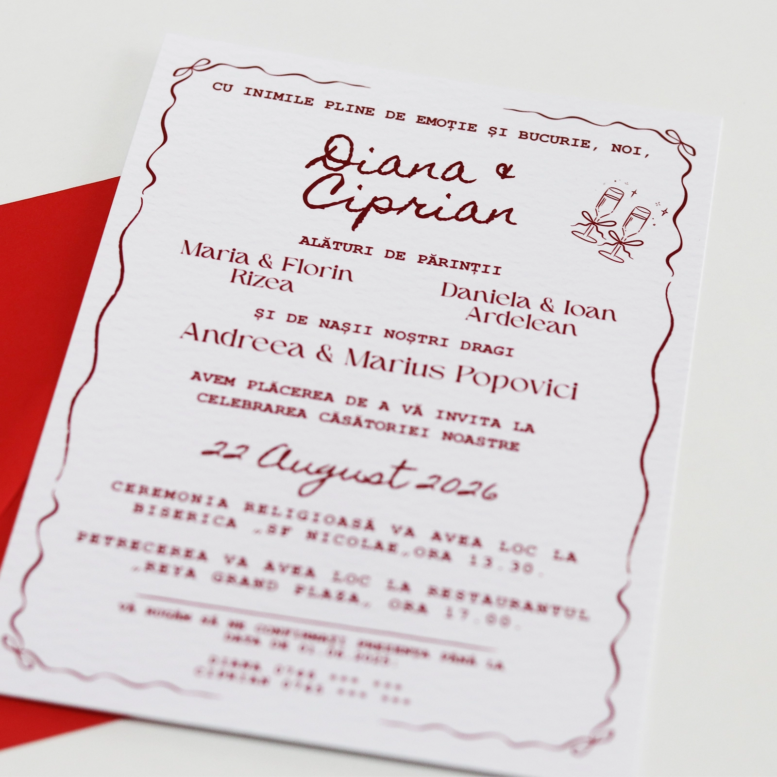 Scriere stilizată, care adaugă un plus de rafinament și sofisticare invitației.