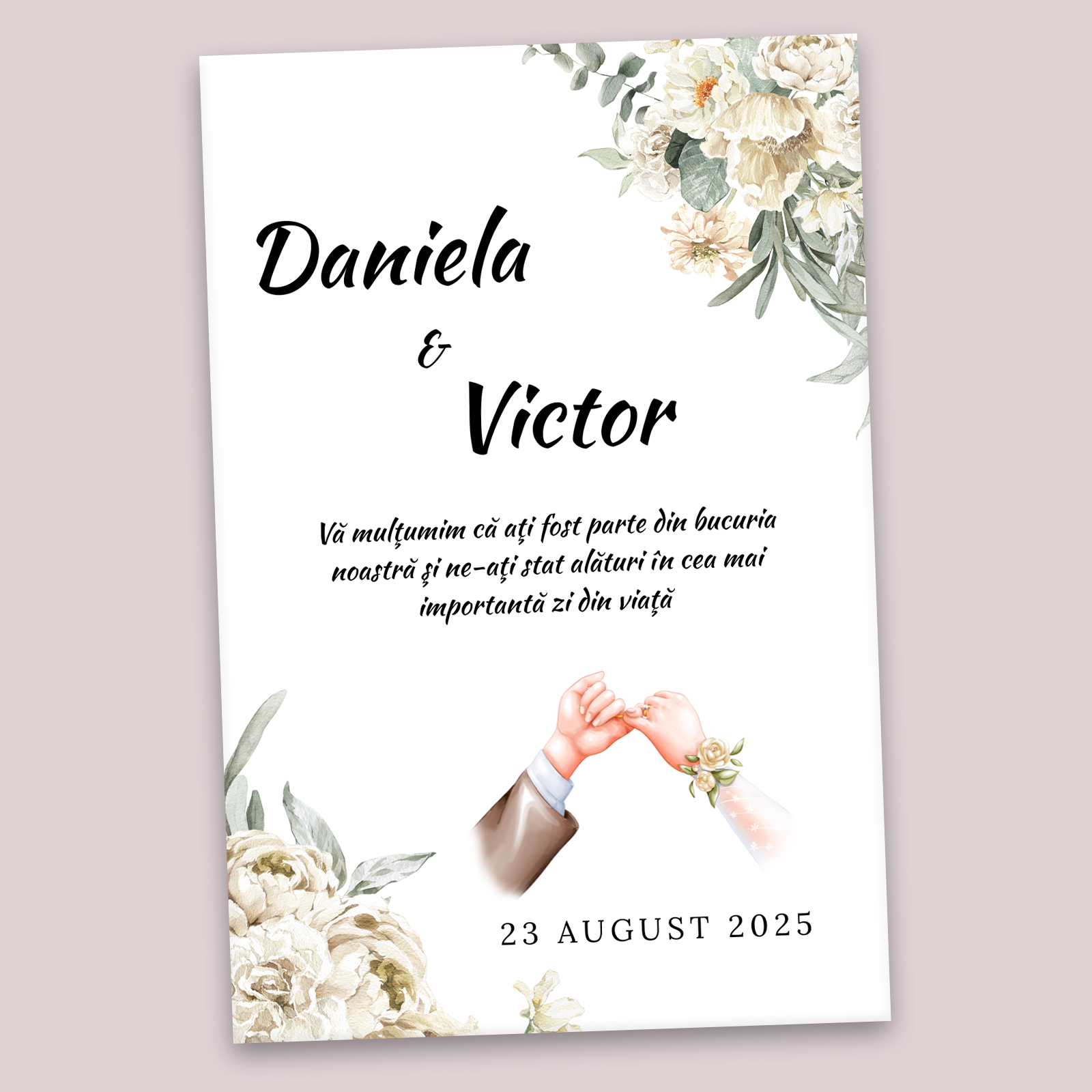Surprinde-ți invitații cu o amintire elegantă și personală! Această mărturie magnetică de nuntă este decorată cu un design floral în nuanțe de crem și verde, completat cu o ilustrație adorabilă de tip pinky promise. Numele mirilor sunt scrise cu un font caligrafic modern, iar data evenimentului este evidențiată într-un mod rafinat.