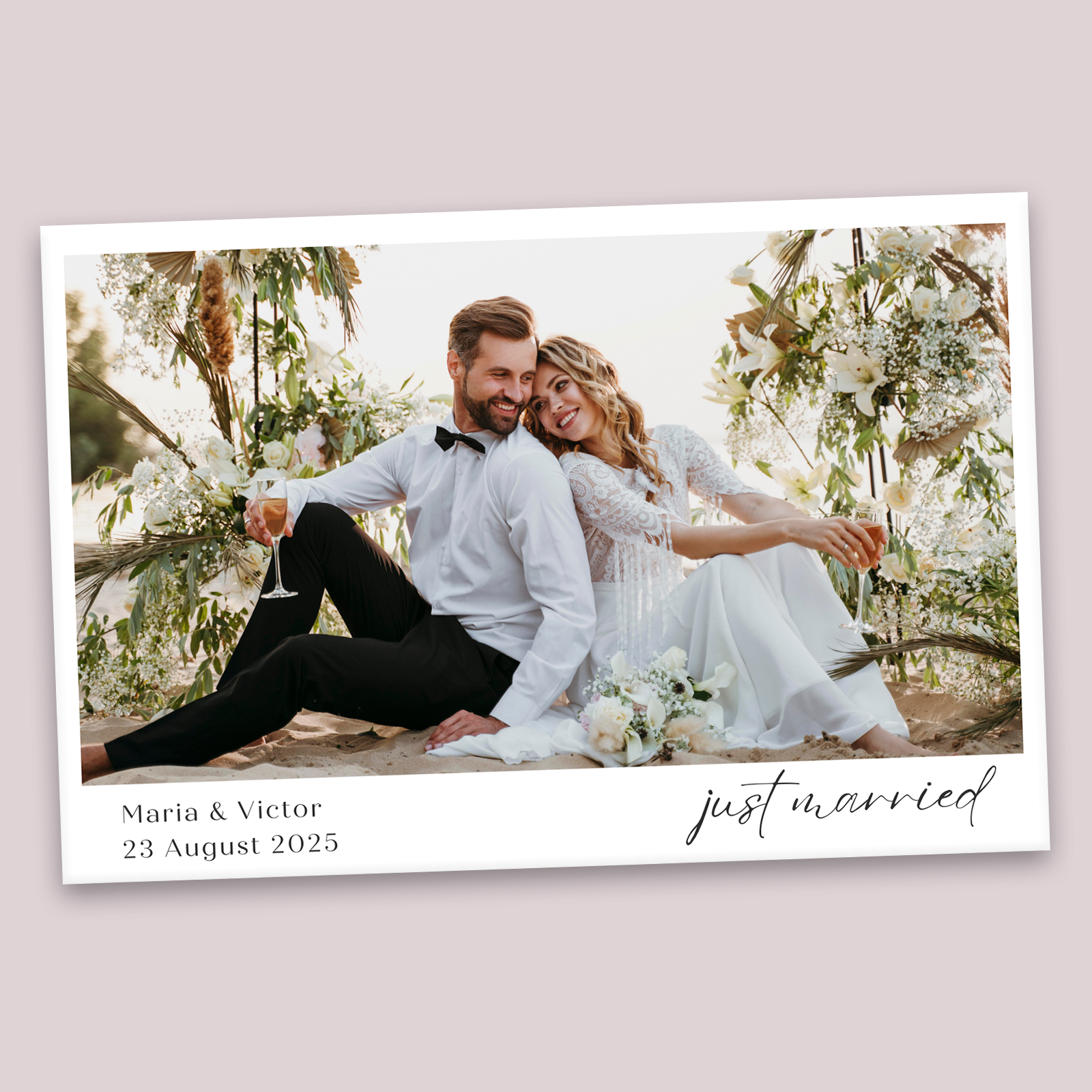 Cu un design elegant, această mărturie include o fotografie de cuplu, data nunții, numele mirilor și un mesaj, toate așezate într-un aranjament rafinat. Este cadoul perfect pentru invitați, o amintire prețioasă care le va aduce mereu un zâmbet.