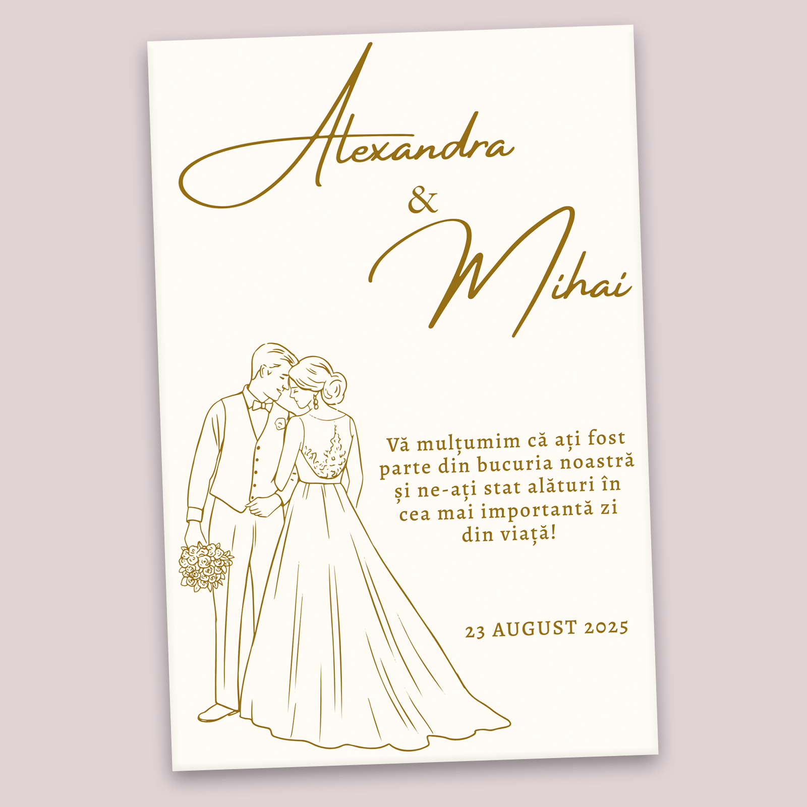 Cu un design rafinat în tonuri aurii și o ilustrație romantică a mirilor, magnetul conține numele voastre, data nunții și un mesaj de mulțumire emoționant. Este un suvenir deosebit, ușor de păstrat, care le va aminti celor dragi de magia acelei zile.