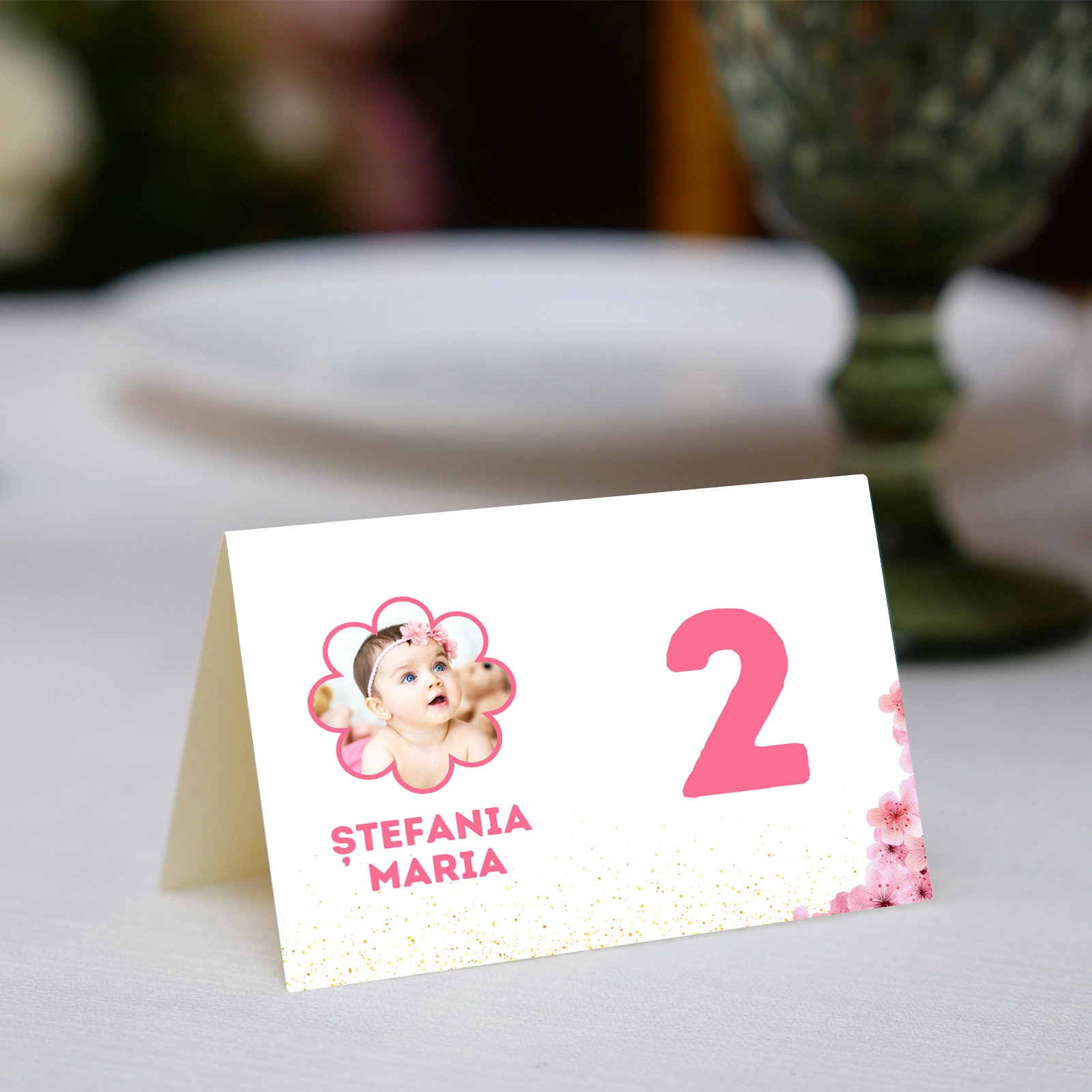 Fiecare număr poate fi personalizat cu culori, fonturi și detalii care se potrivesc tematicii botezului, creând un decor unitar împreună cu invitațiile și meniurile. Dimensiunea de 13,5 x 21 cm asigură vizibilitate optimă, facilitând identificarea meselor și adăugând un plus de eleganță decorului.