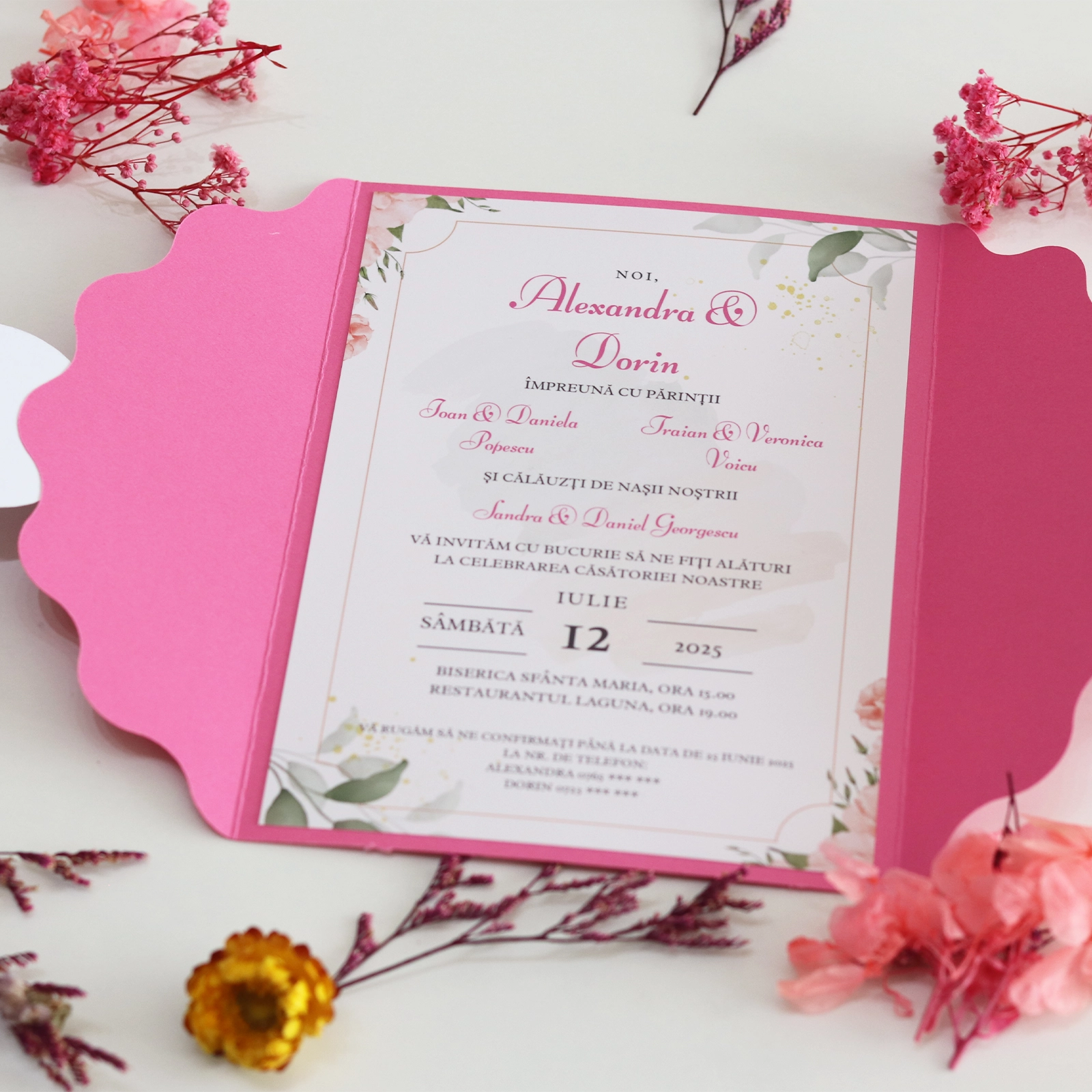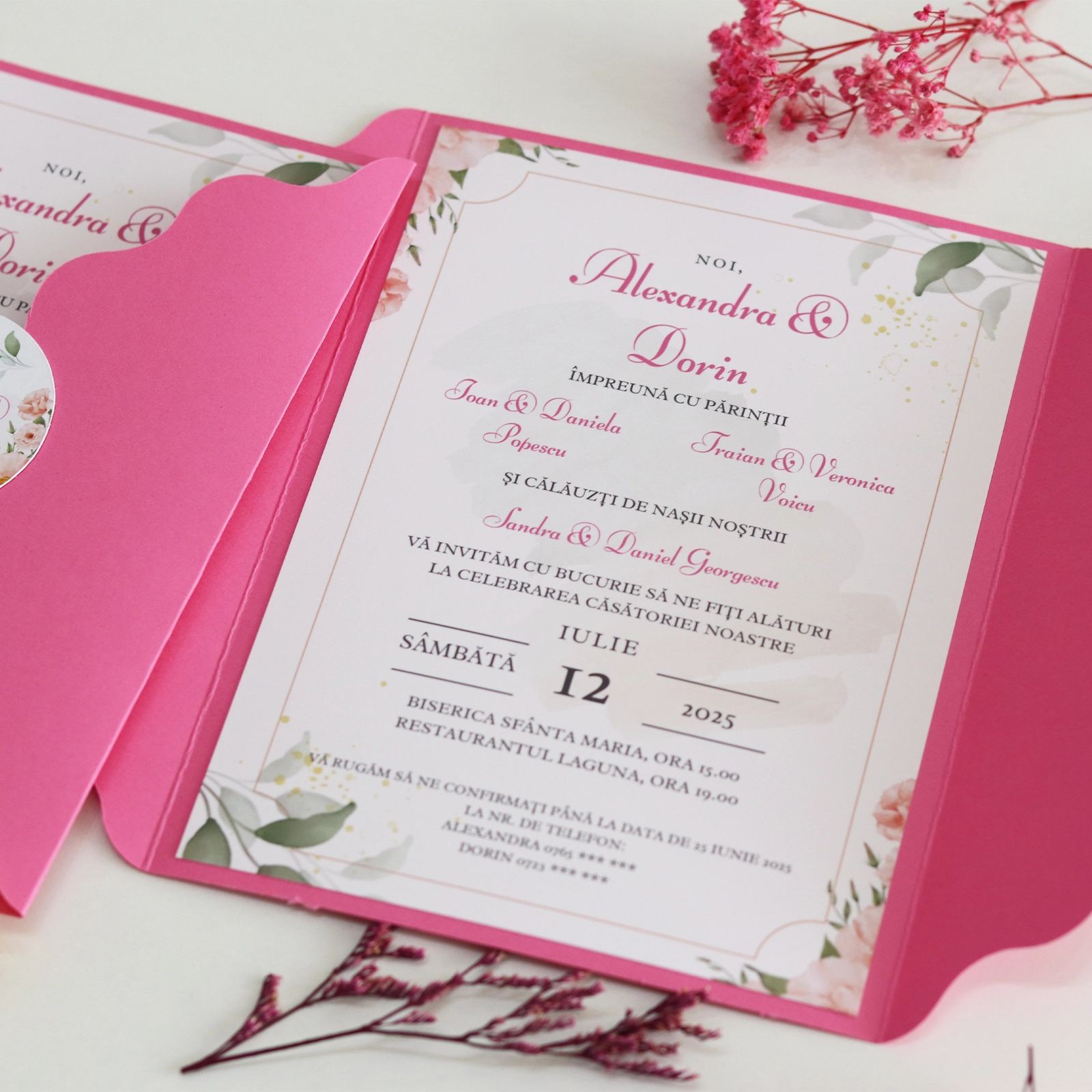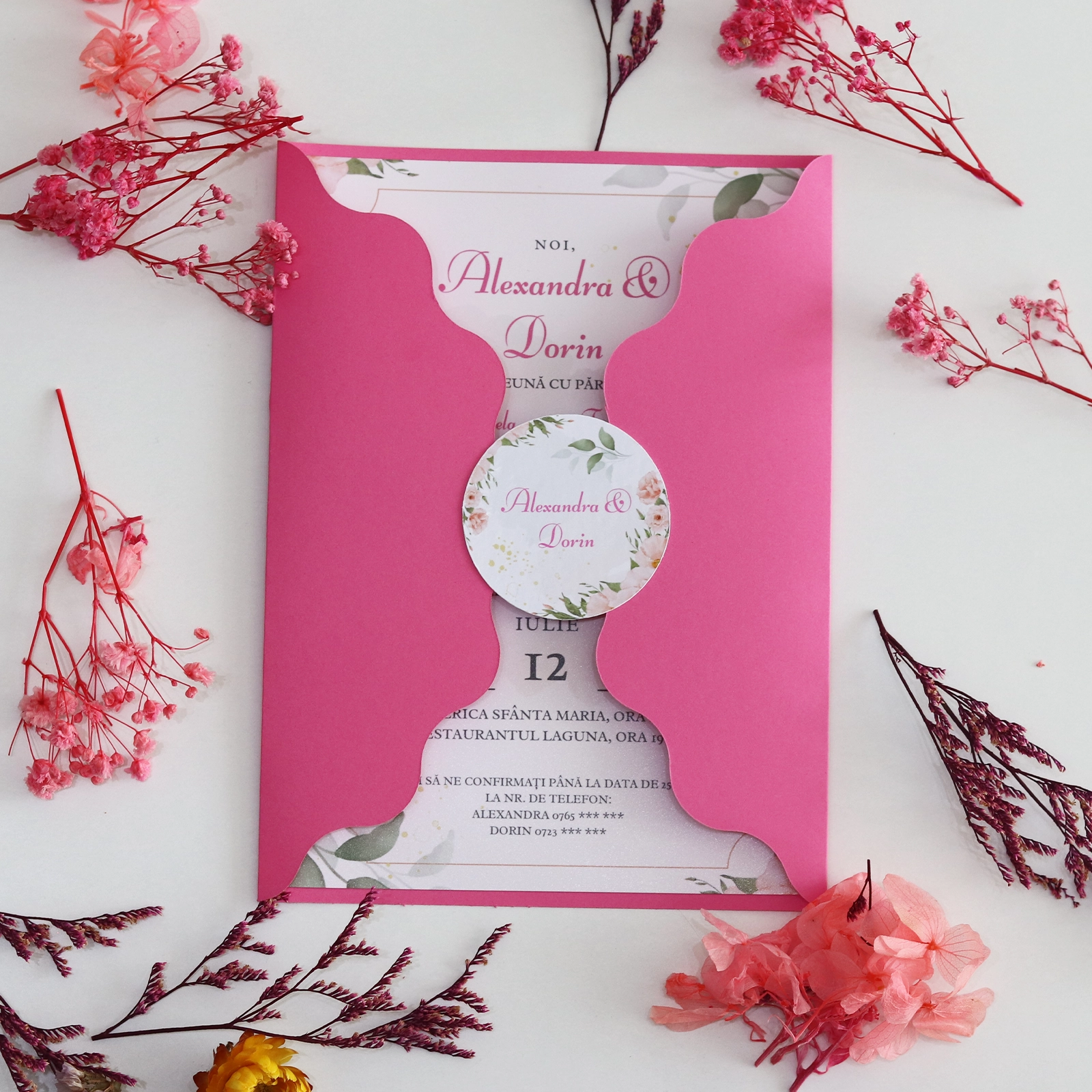 Această invitație de nuntă roz cu plic handmade este alegerea perfectă pentru cuplurile care apreciază eleganța subtilă. Fiecare invitație este creată cu grijă, pentru ca invitații tăi să simtă din primul moment emoția evenimentului.