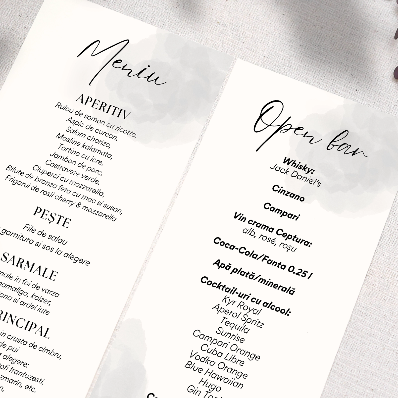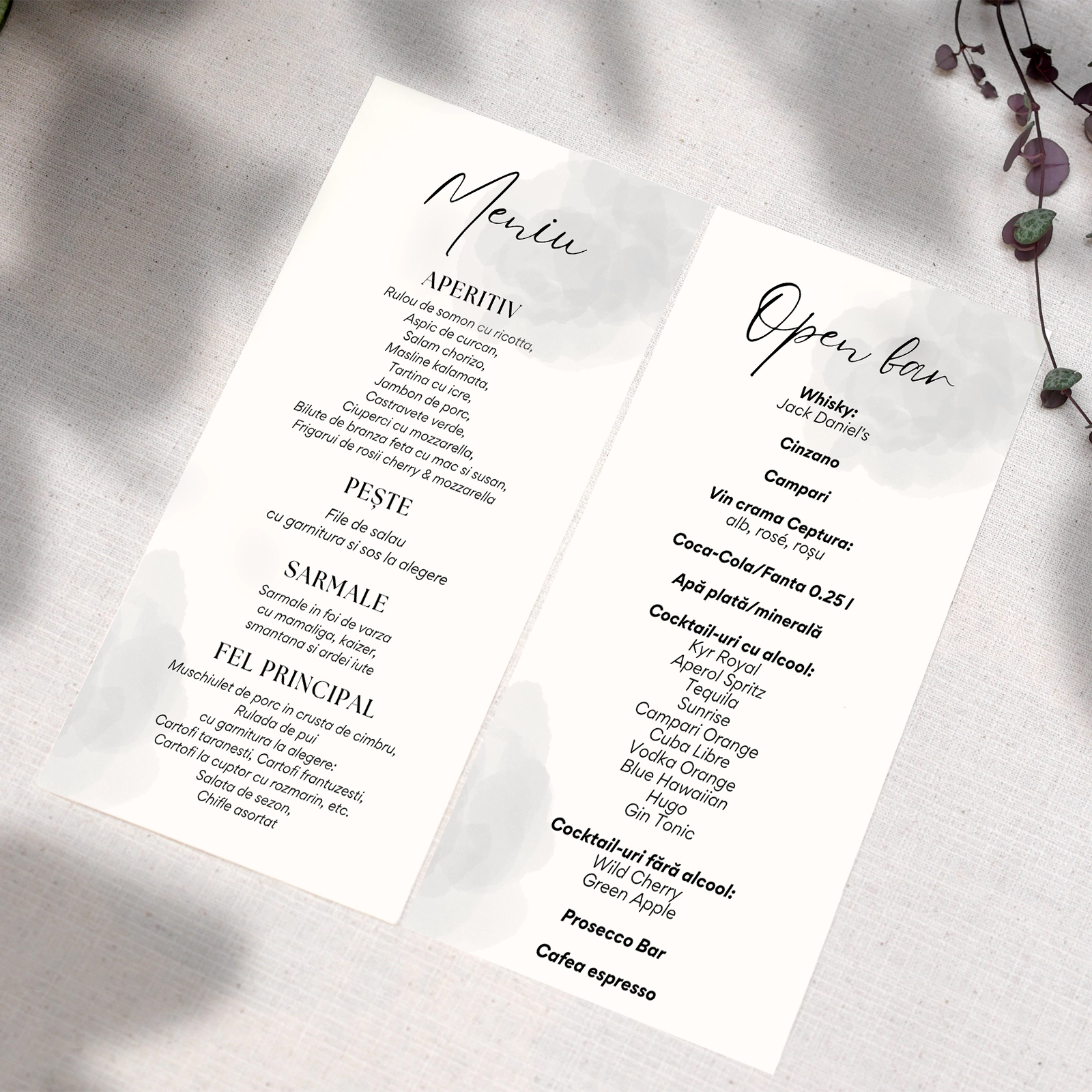 Completează aranjarea meselor cu un element discret și rafinat prin meniul individual de nuntă cu fundal gri. Designul modern, în tonuri neutre, oferă un aer elegant și echilibrat, potrivit pentru nunți clasice, minimaliste sau contemporane.