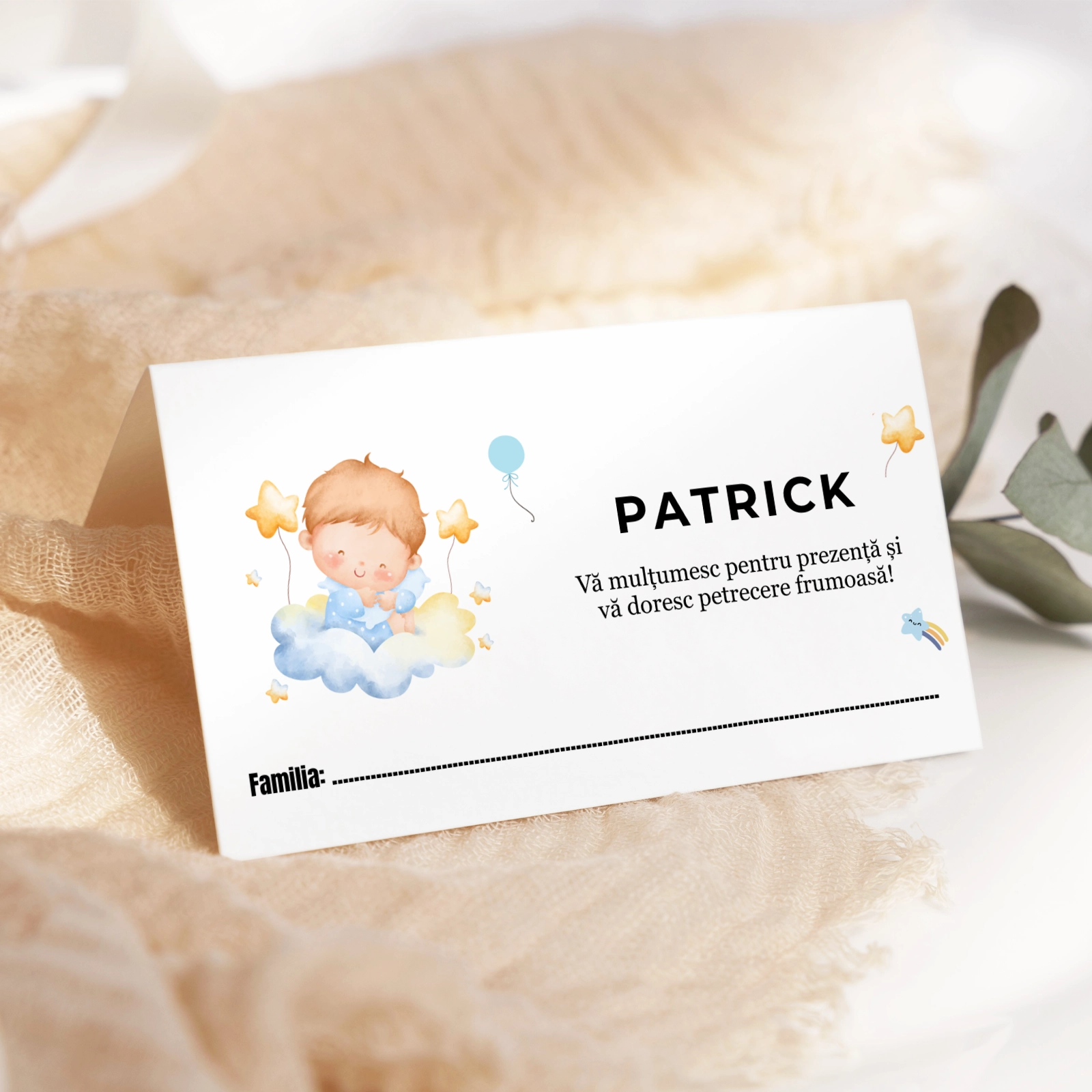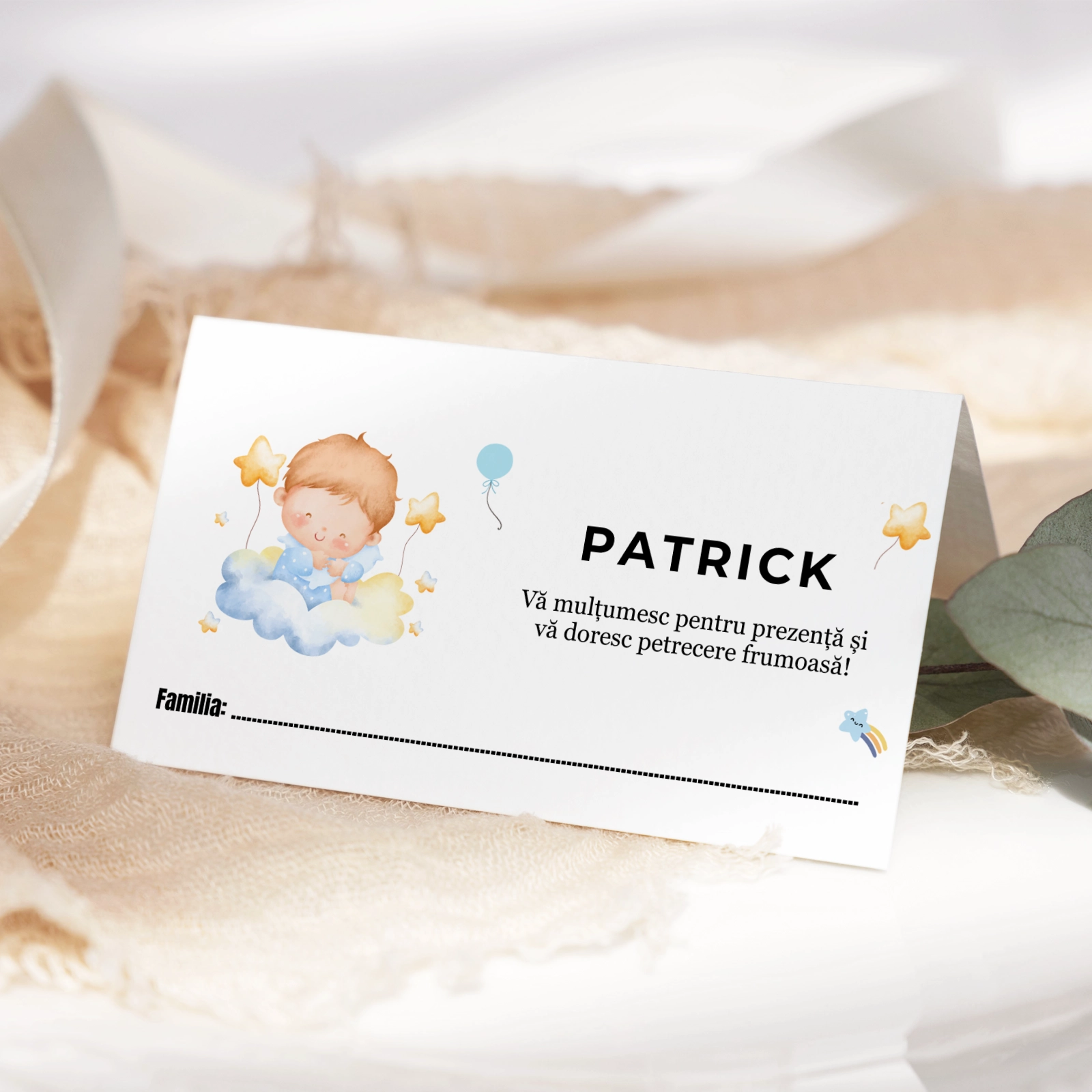 Design delicat și atrăgător, potrivit pentru botezurile de băieți.