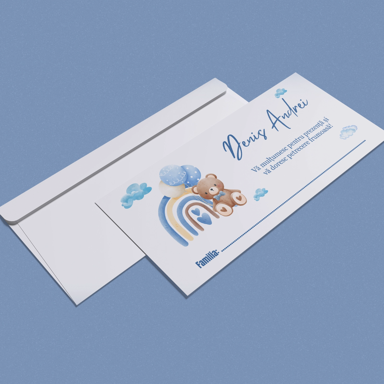 Designul delicat, cu ursuleț, adaugă un plus de farmec și căldură, fiind potrivit pentru botezuri clasice, moderne sau tematice. Plicul de bani pentru botez nu este doar practic, ci și un detaliu estetic care completează armonios decorul evenimentului.