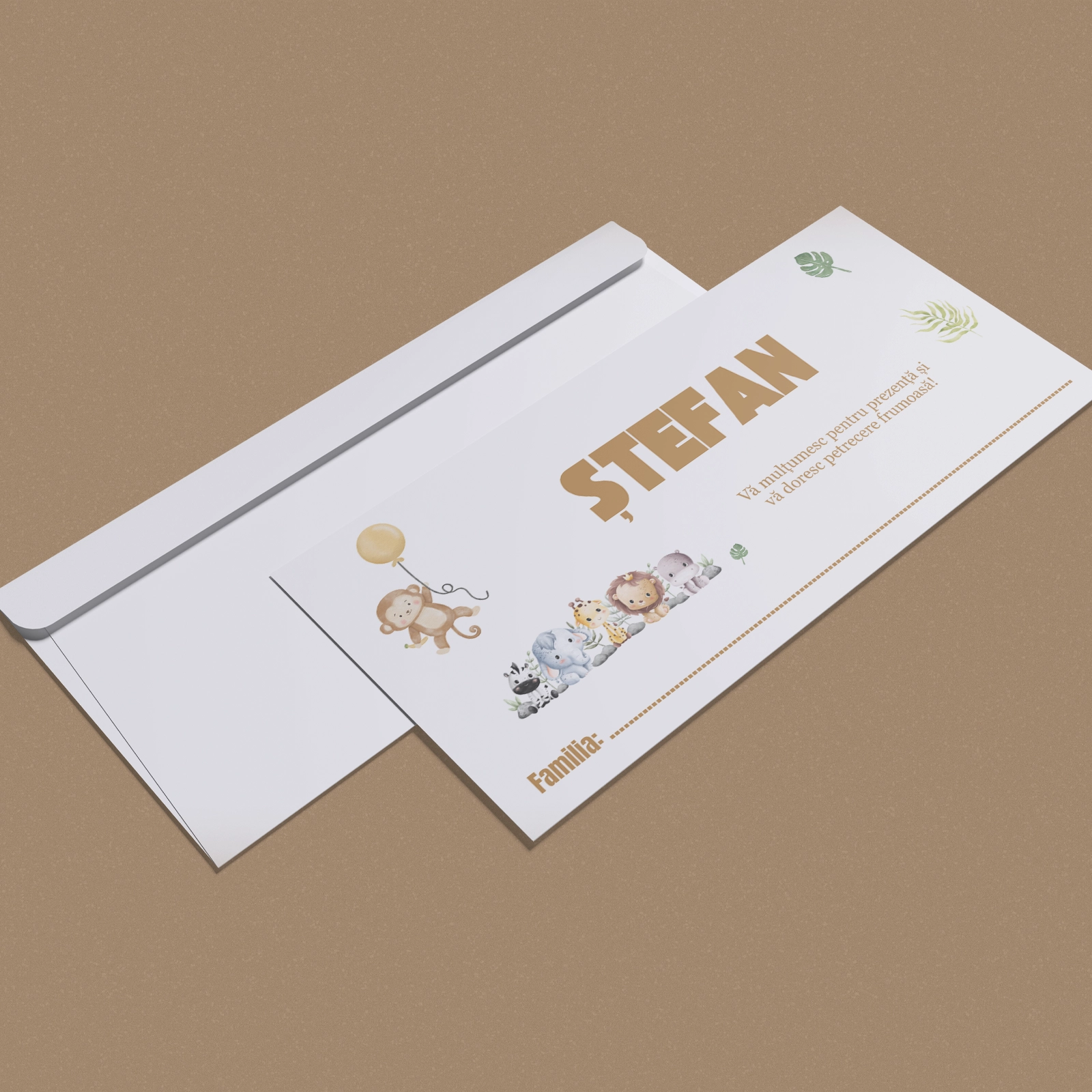 Designul cu tematică junglă, ilustrat cu animale simpatice și elemente naturale, aduce un aer jucăuș și vesel, perfect pentru botezuri tematice sau moderne. Plicul de bani pentru botez devine astfel nu doar un accesoriu practic, ci și un detaliu decorativ care completează atmosfera evenimentului.