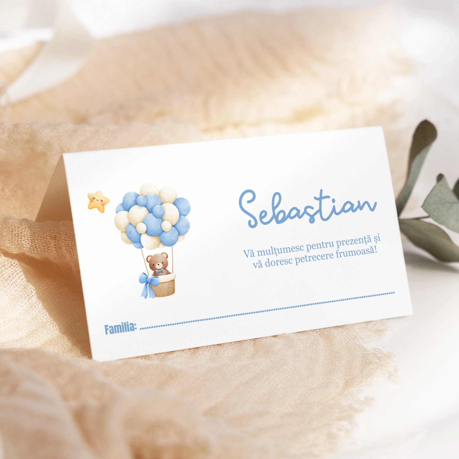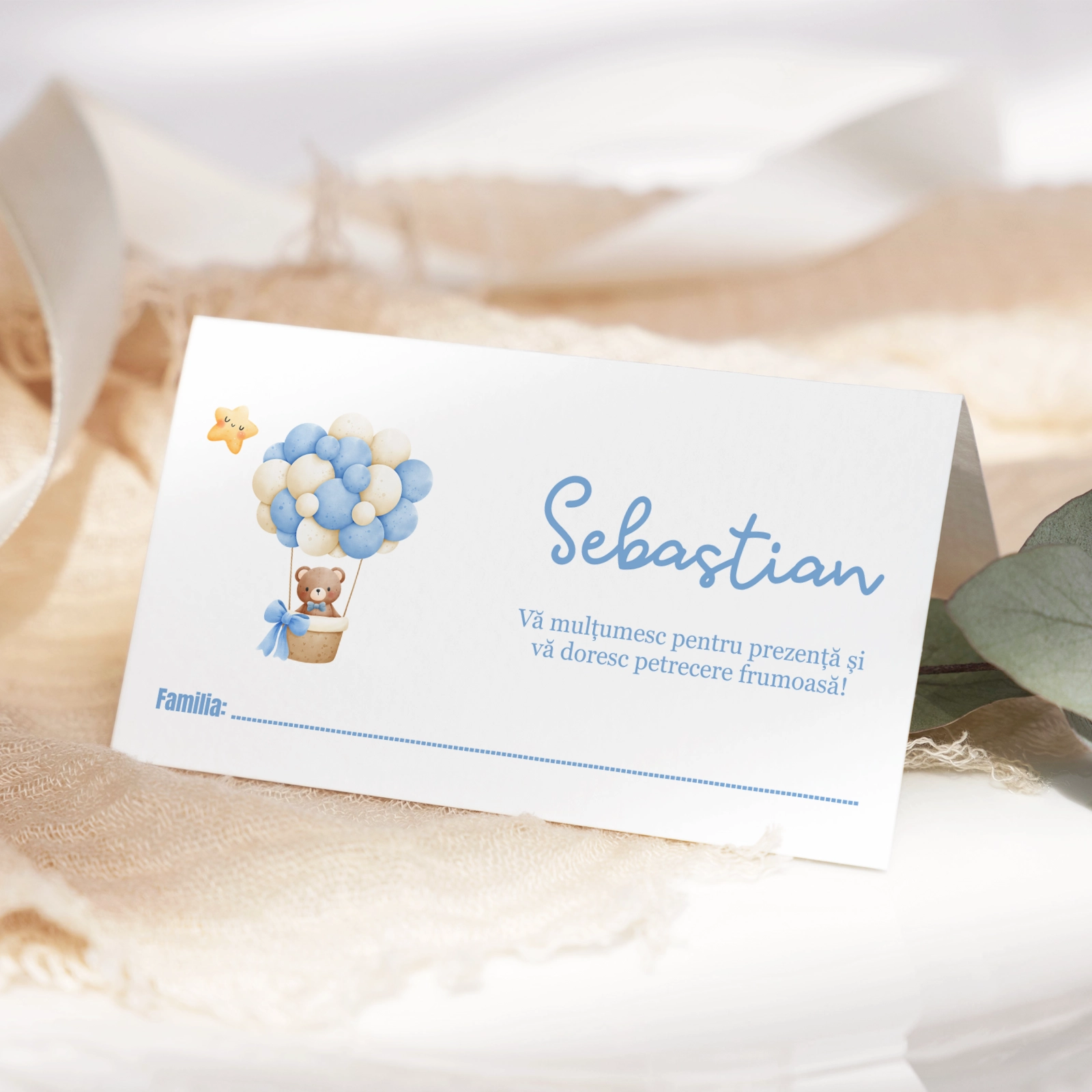Oferă un cadou de botez cu stil și grijă pentru detalii – alege plicul bani albastru cu ursuleț cu baloane de la Bright Invitation!