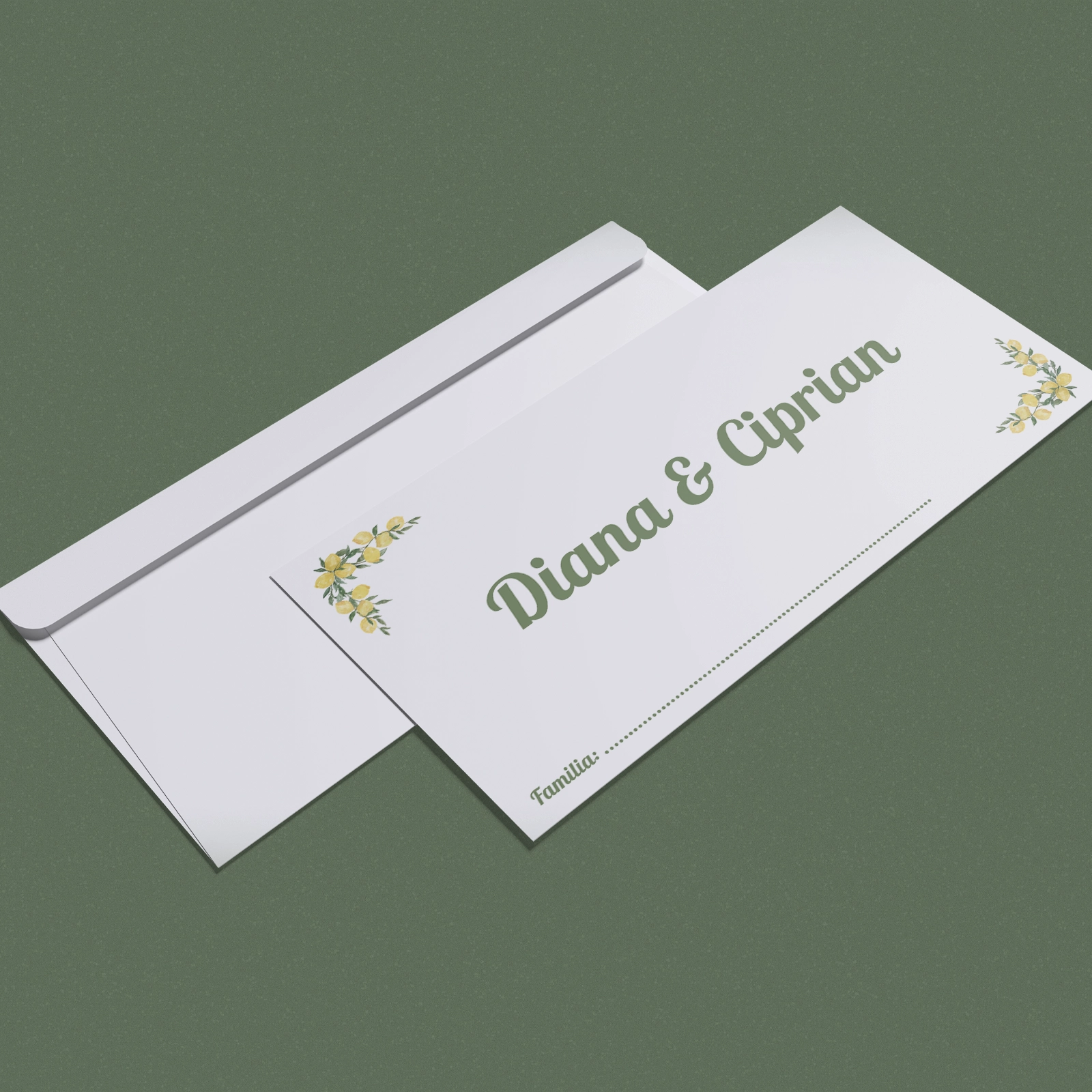 Imaginea este reprezentativă pentru varianta de plic din hârtie DL. Pentru varianta din carton, plicul este realizat handmade, iar aspectul poate prezenta mici variații, fiecare piesă fiind lucrată individual. Varianta din carton lucios este realizată handmade și pliată în 3, fiecare plic fiind unic și putând prezenta mici variații.
