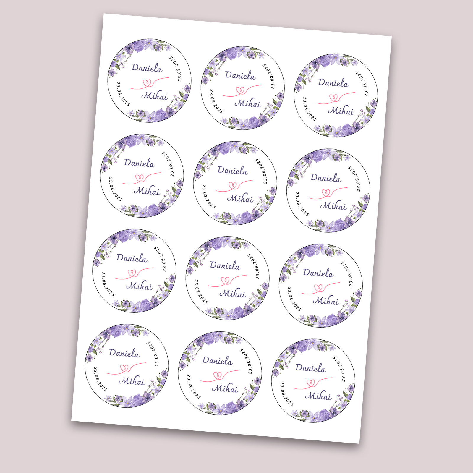 Set stickere nuntă personalizate cu nume miri și dată - design floral