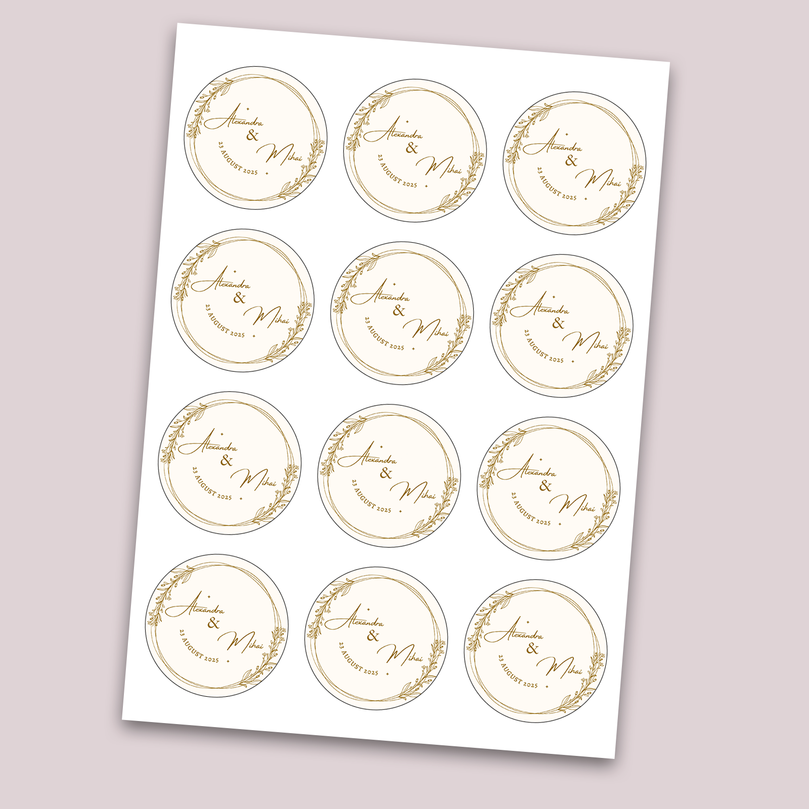 Oferă o notă elegantă și personală nunții tale cu aceste stickere personalizate cu numele mirilor și dată. Ideale pentru invitați, mărturii, plicuri sau cutii, aceste etichete autocolante decorative sunt un detaliu special care transformă orice obiect într-o amintire de neuitat.